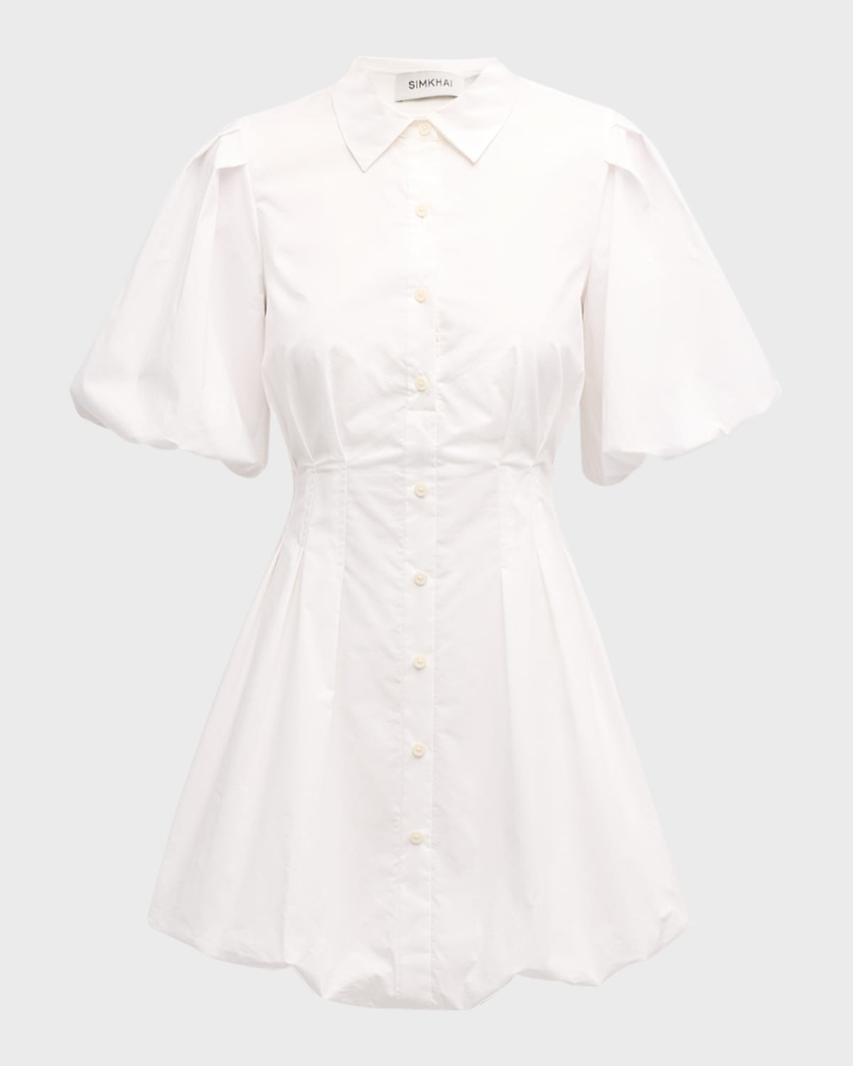 SIMKHAI "Cleo" pleated poplin shirtdress Approx. 34"L from shoulder to hem Spread collar; button front Short balloon sleeves Slim pintuck waist Aline silhouette Midthigh length Bubble hem Cotton/polyester/polyurethane Dry clean or machine wash cold Imported Size Note: Height: 5'10"/ waist 24"/ hips 34"/ bust 32" Model is wearing size 2