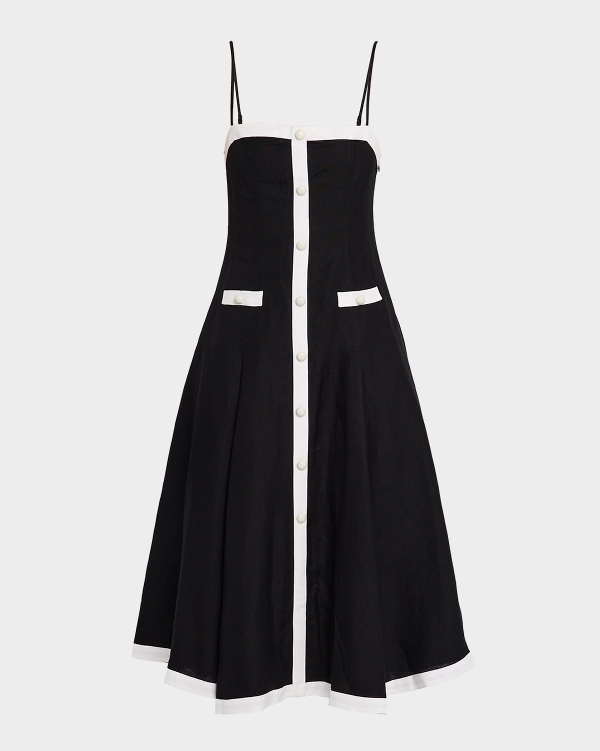 - Framed with adjustable spaghetti straps, the Cordelia dress by SIMKHAI features bold colorblocked trim - Approx. 41"L from shoulder to hem - Square neckline; button front - Sleeveless - Front welt pockets - Full a-line skirt - Hem falls below the knee - Smocked back panel - Linen/viscose - Lining: Cotton - Dry clean - Imported