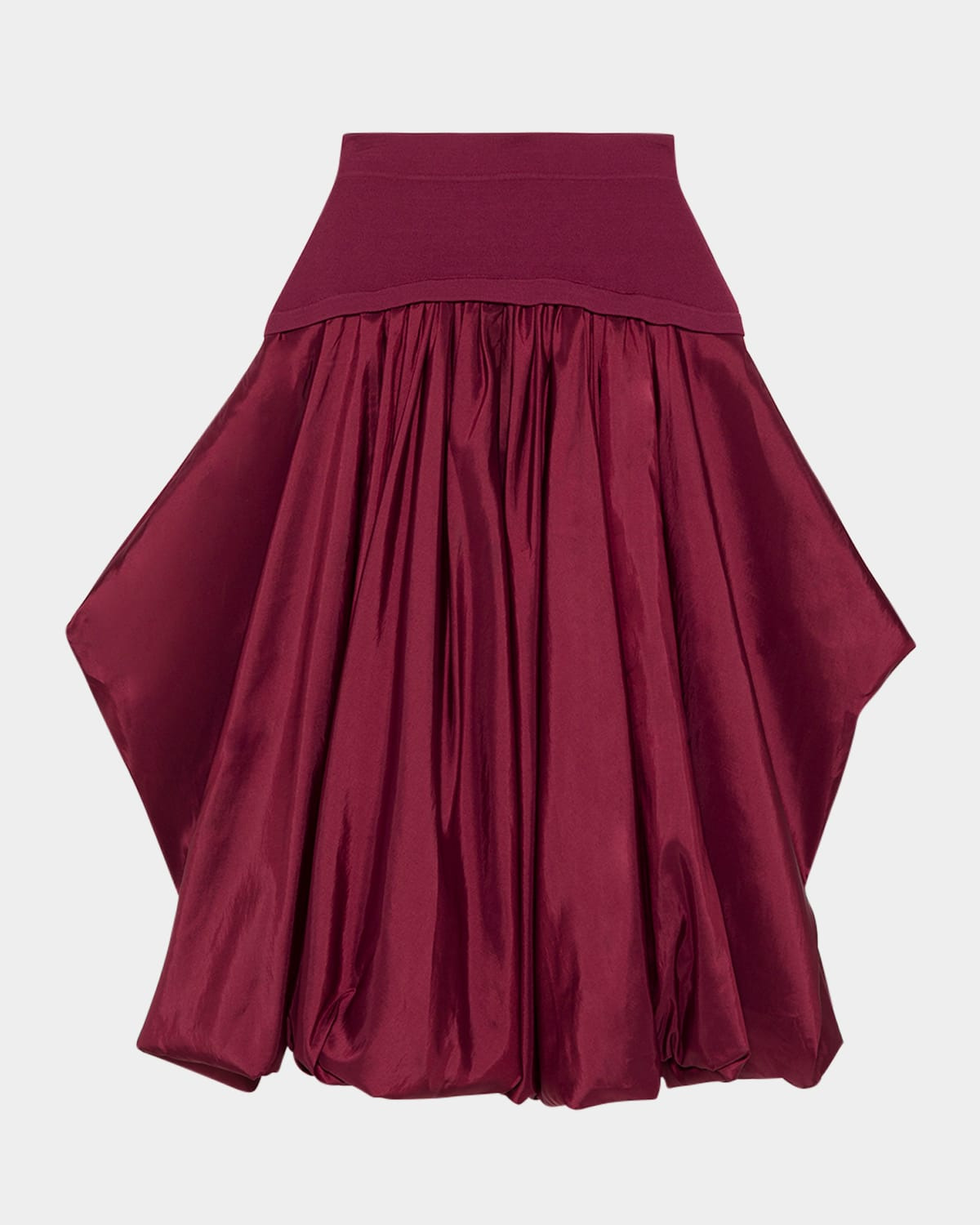 - SIMKHAI "Corinn" mixed media midi skirt features a knit waistband and ruched taffeta skirt, gathered on the sides for a draped silhouette - Sits high on the hips - On-seam pockets - Bubble hem - Hem falls below the knee - A-line silhouette - Pull-on style - Viscose/elastane - Dry clean - Imported