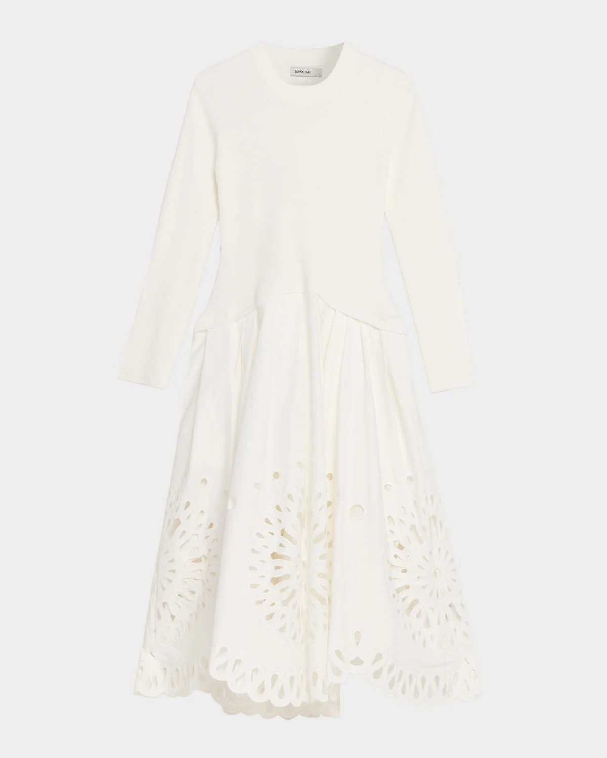 This "Daila" midi dress from SIMKHAI combines a comfortable ribknit bodice with a crisp pleated cotton skirt, detailed with bursts of eyelet embroidery Approx. 50"L from shoulders to hem Jewel neckline Long sleeves Split cuffs Scalloped hem Hem falls below the knee Aline silhouette Slipover style Viscose/nylon/polyamide Dry clean Imported