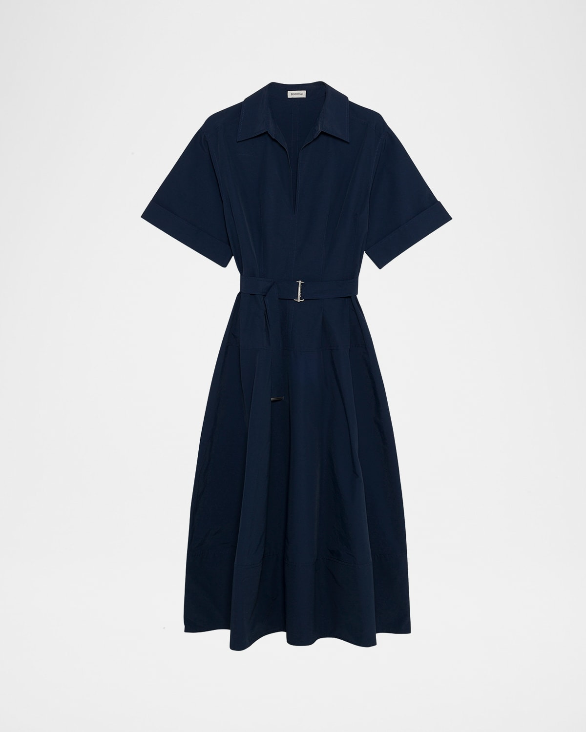 - SIMKHAI "Deanna" midi dress featuring a belted waist - Point collar; V neckline - Short cuffed sleeves - Side seam pockets - A-line silhouette - Hem falls below the knee - Slipover style - Cotton/nylon/polyamide - Dry clean - Imported