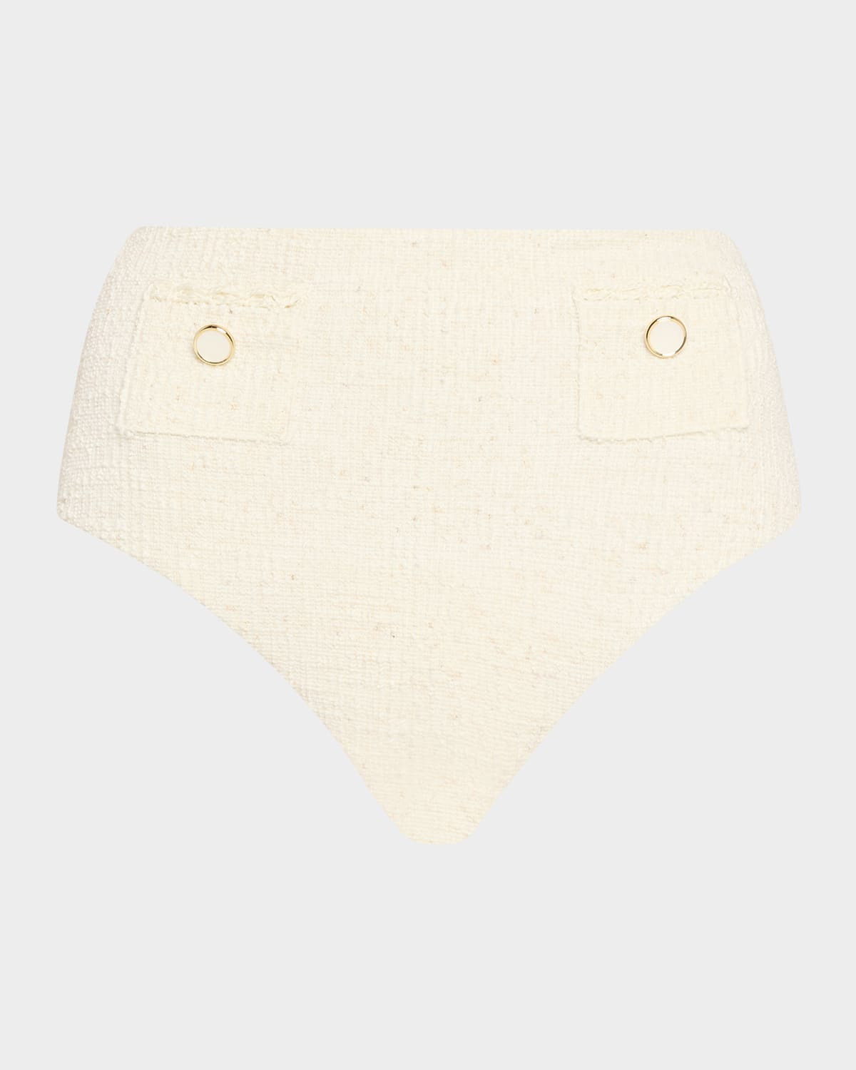 The "Diana" bikini bottoms by SIMKHAI are crafted from a textured tweed for a structured silhouette High waist Faux front pocket details Moderate seat coverage Polyester/rayon/cellulose acetate/linen Lining: Nylon/spandex Hand wash or dry clean Imported Top sold separately