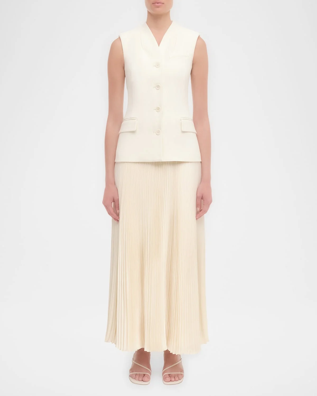 - SIMKHAI "Georgina" vest midi dress finished with pleating - V neckline - Sleeveless - Hip flap pockets - Drop-waist silhouette - Full length - Button-front; invisible back zip - Viscose/polyester/elastane - Dry clean - Imported