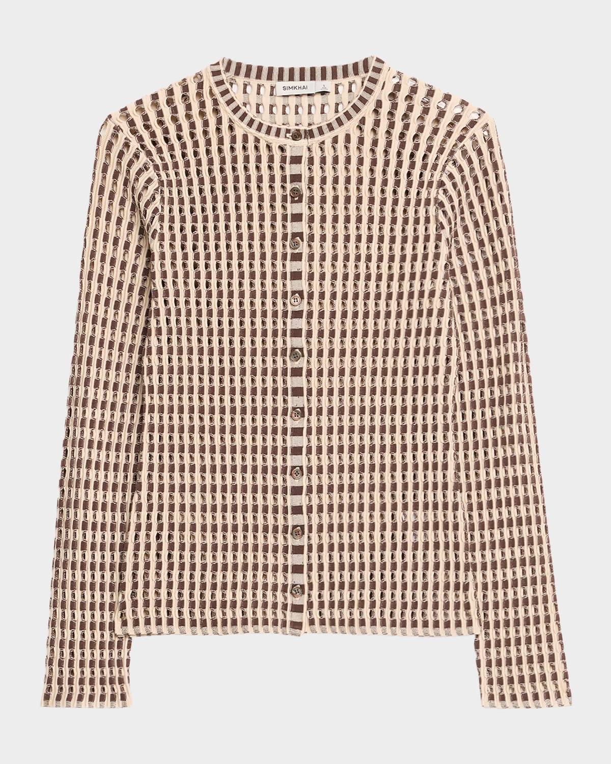 SIMKHAI "Gracen" cardigan featuring lasercut detailing Crew neckline Long sleeves Fitted Hem falls to the hip Buttonfront Rayon/cellulose acetate/polyester Dry clean Imported