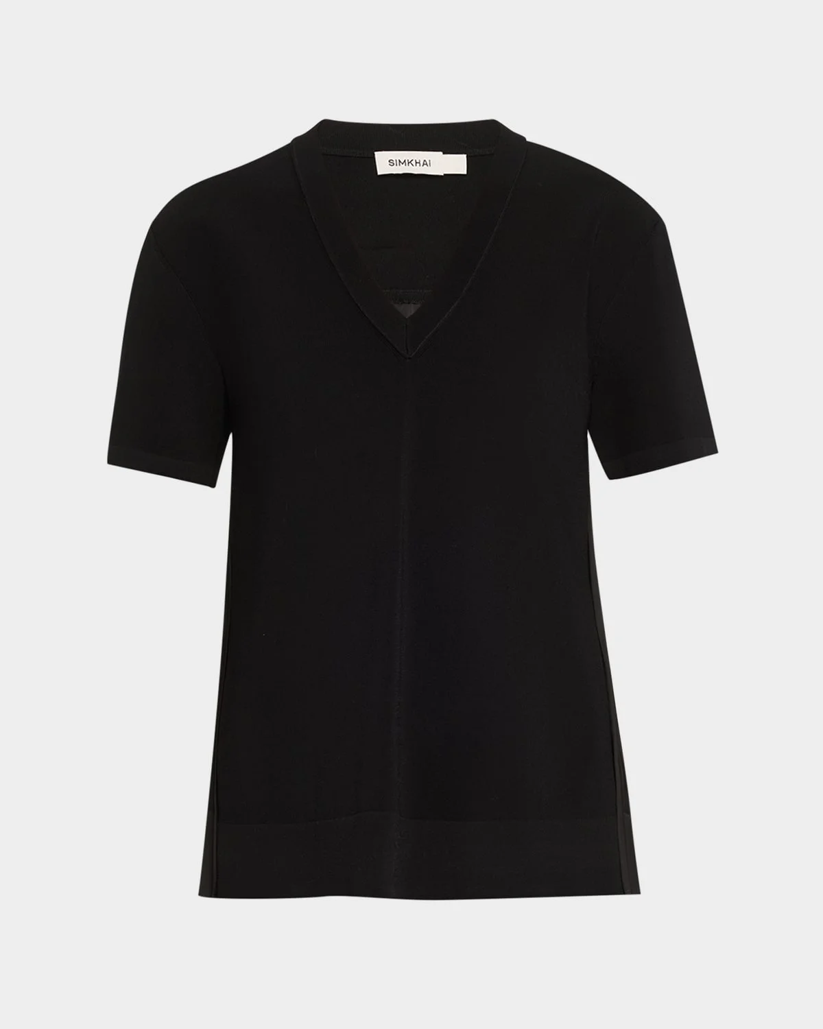 SIMKHAI "Guthrie" tunic top elevated with a pleated back V neckline Short sleeves Easy fit Hem falls to the hip Pullover style Rayon/cellulose acetate/polyester/nylon/polyamide Dry clean Imported