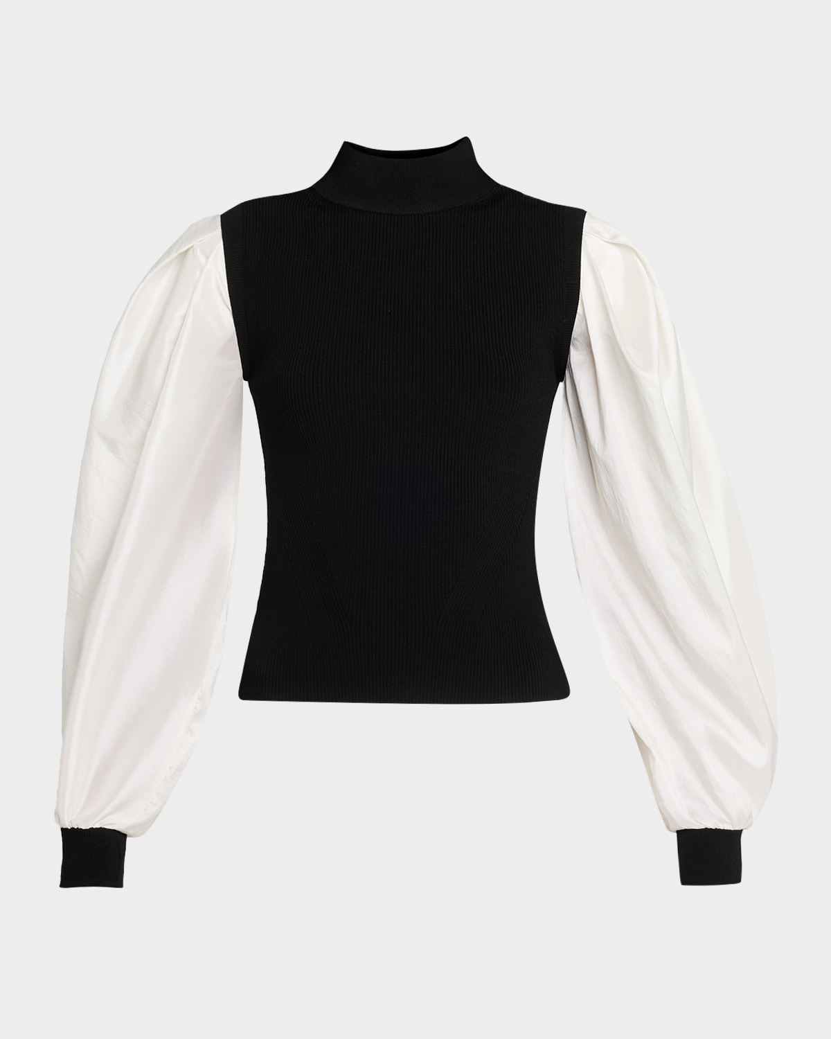 The "Jackie" top from SIMKHAI combines fine rib knitting with shiny and voluminous taffeta, finished with softly structured shoulder pleats Approx. 21"L from shoulders to hem Mock neckline Long blouson sleeves Ribbed cuffs Slim fit Pullover style Viscose/elastane Dry clean Imported