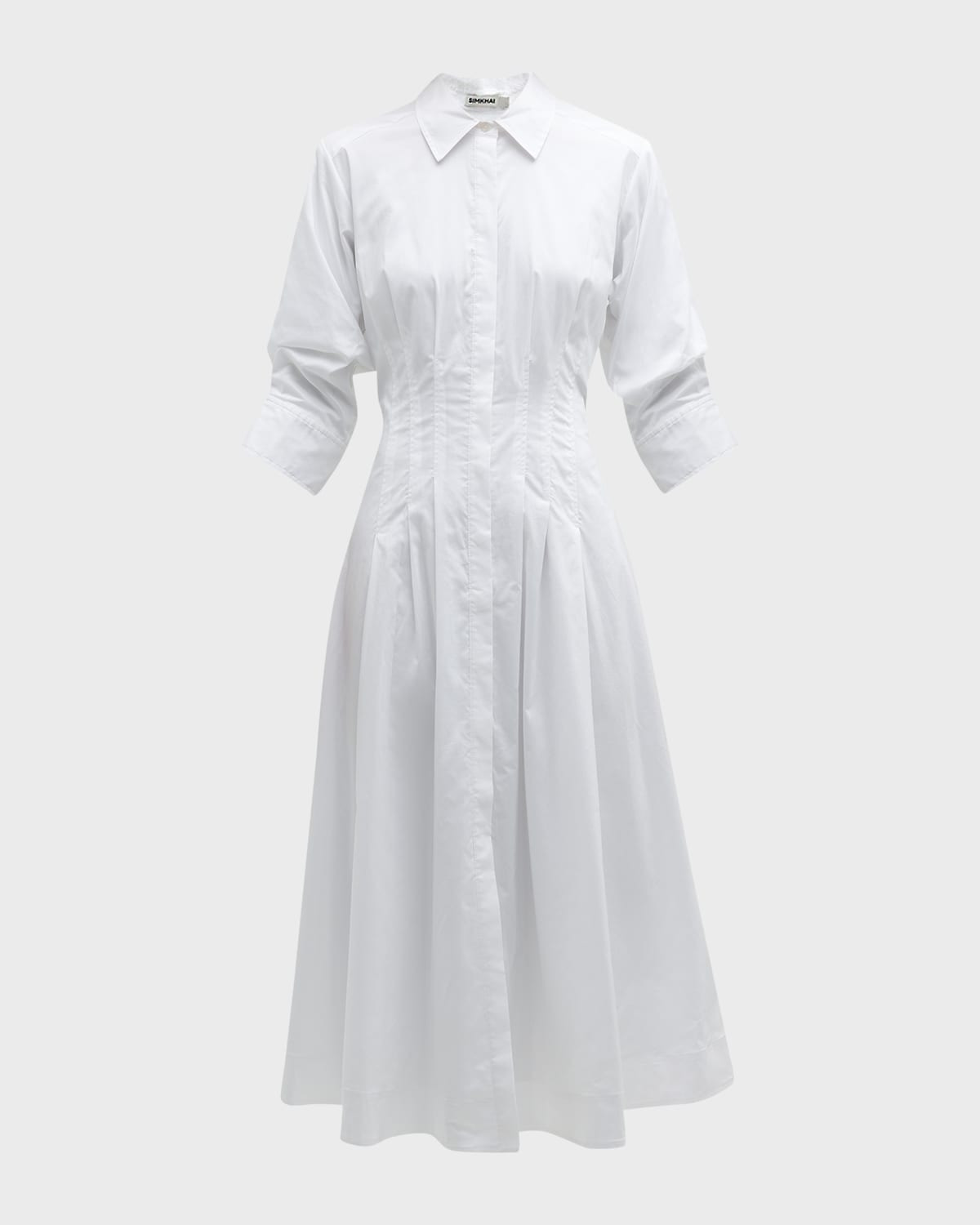 - SIMKHAI "Jazz" poplin pintuck shirtdress finished with button cuffs - Spread collar - Three-quarter sleeves - Concealed button front - A-line silhouette - Hem falls below the knee - Cotton/polyester - Dry clean - Imported - Model is 5'10"/177cm.