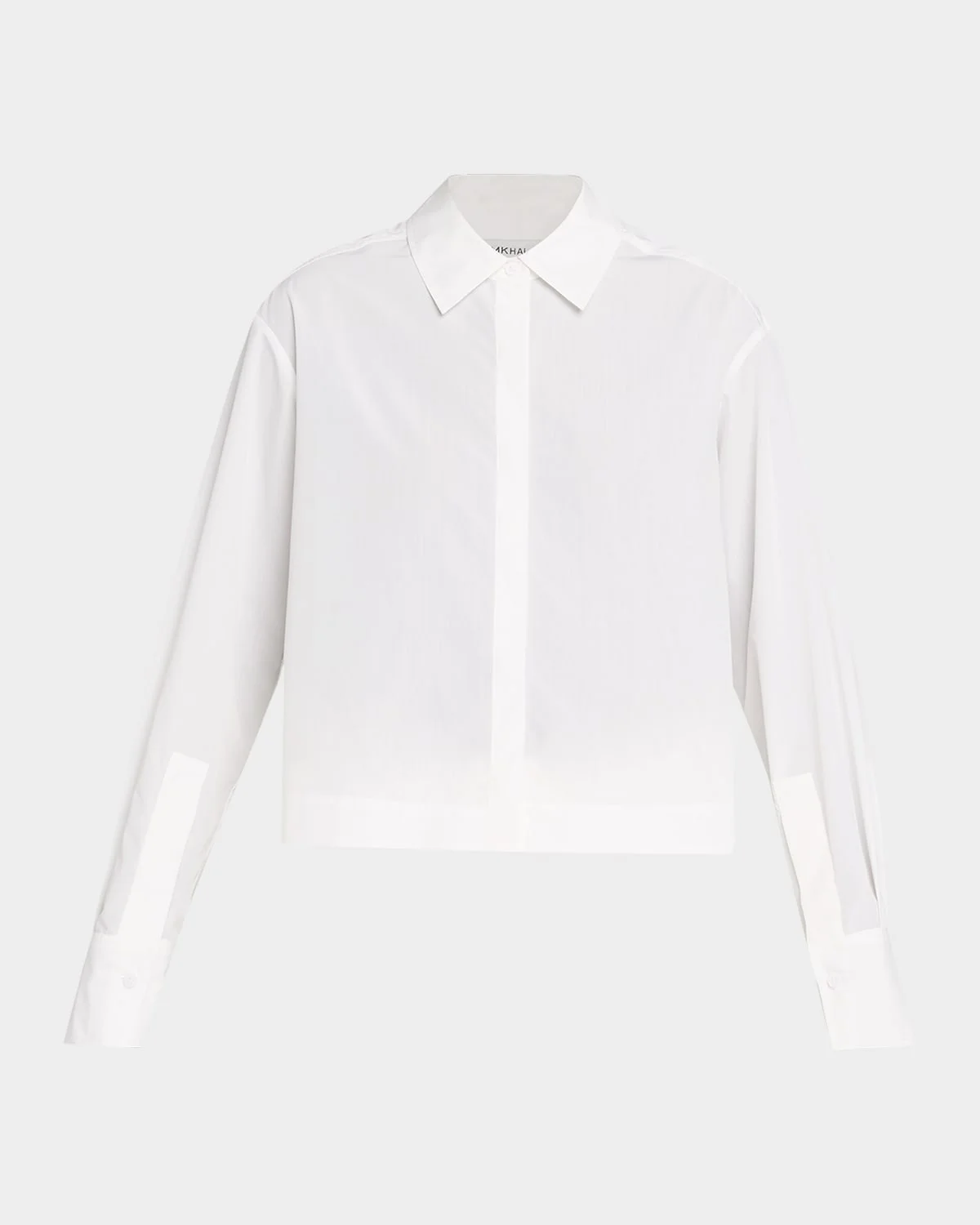 The "Kacey" top by SIMKHAI boasts a classic silhouette that balances & nbsp;crisp cotton poplin with the soft energy of delicate lace paneling. Point collar Long sleeves with button cuffs Classic fit Hem falls to the hip Hidden button-front & nbsp; Polyester Dry clean Imported SIZE & FITModel measurements: 5 & apos;10" tallModel is wearing a US size 4/Small