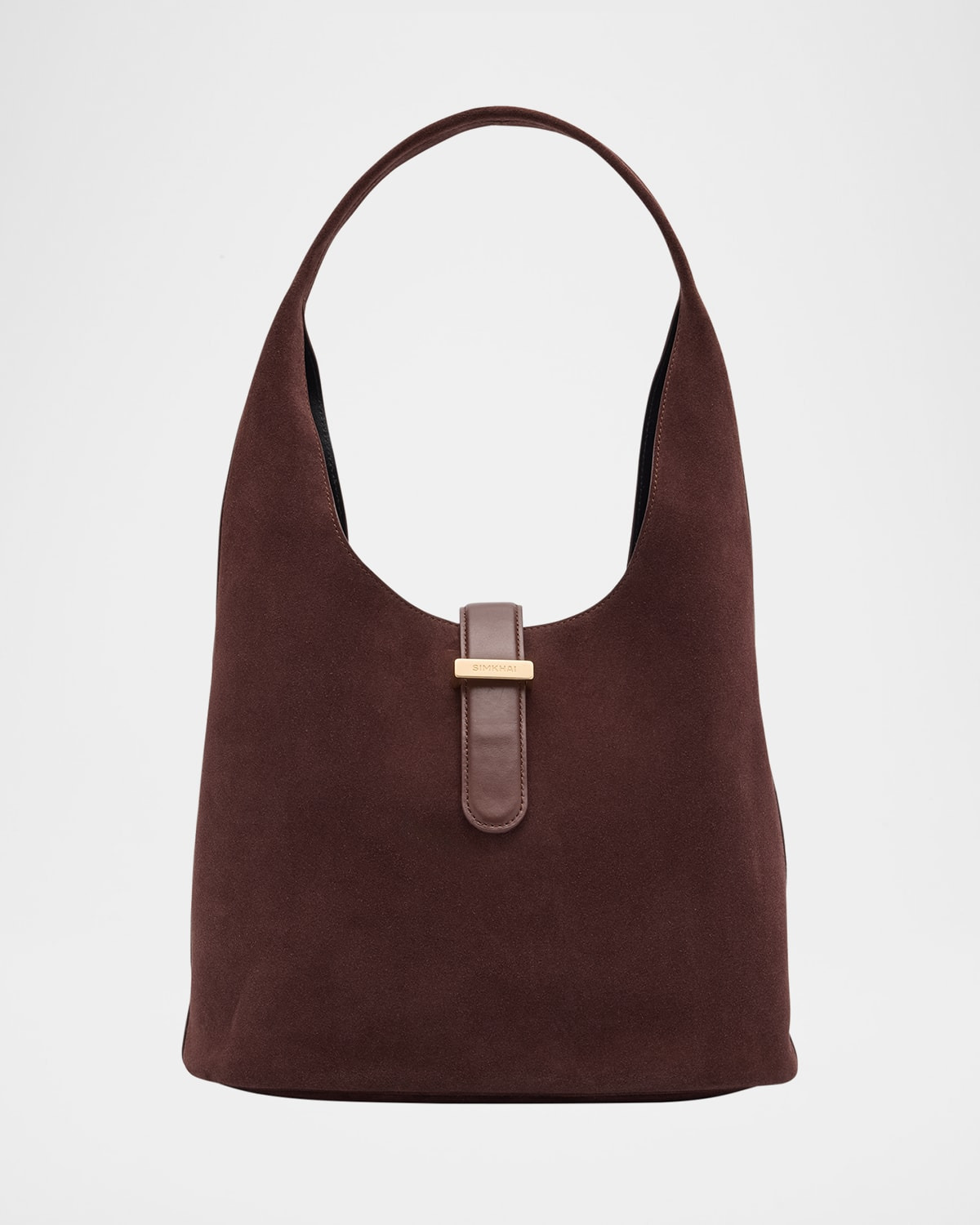 - SIMKHAI "Khai" hobo bag in suede and leather - Shoulder straps - Open top with center buckle strap closure - Interior, three card slots - Approx. 10.6"H x 15.8"W x 5.9"D - Imported