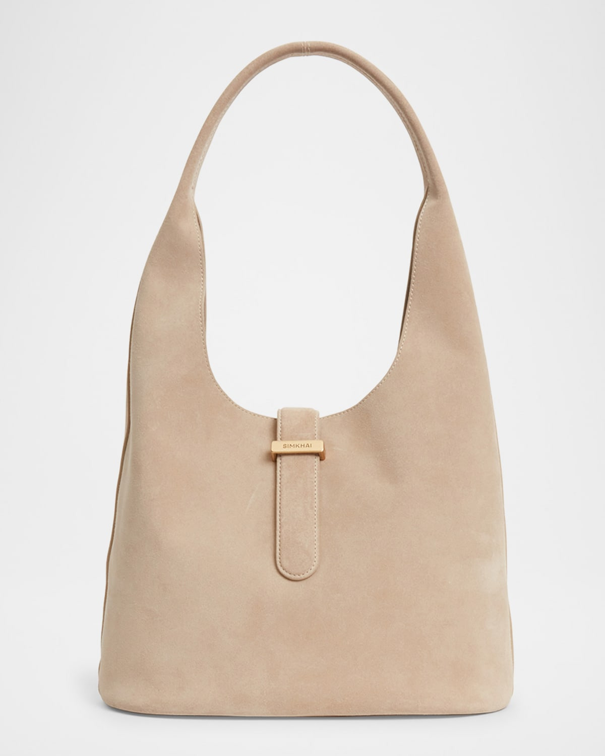 - SIMKHAI "Khai" hobo bag in calfskin suede - Flat top handles, 9.8" drop - Open top with strap closure - Lining: Polyurethane - Approx. 10.6"H x 15.8"W x 5.9"D - Imported