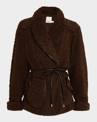 SIMKHAI "Kimia" soft faux fur (polyester) jacket outlined with vegan leather trim (polyurethane/polyester) Shawl collar; button closure Long sleeves Selftie belt cinches the waist Front patch pockets Hits below the hips Polyester Dry clean only Imported