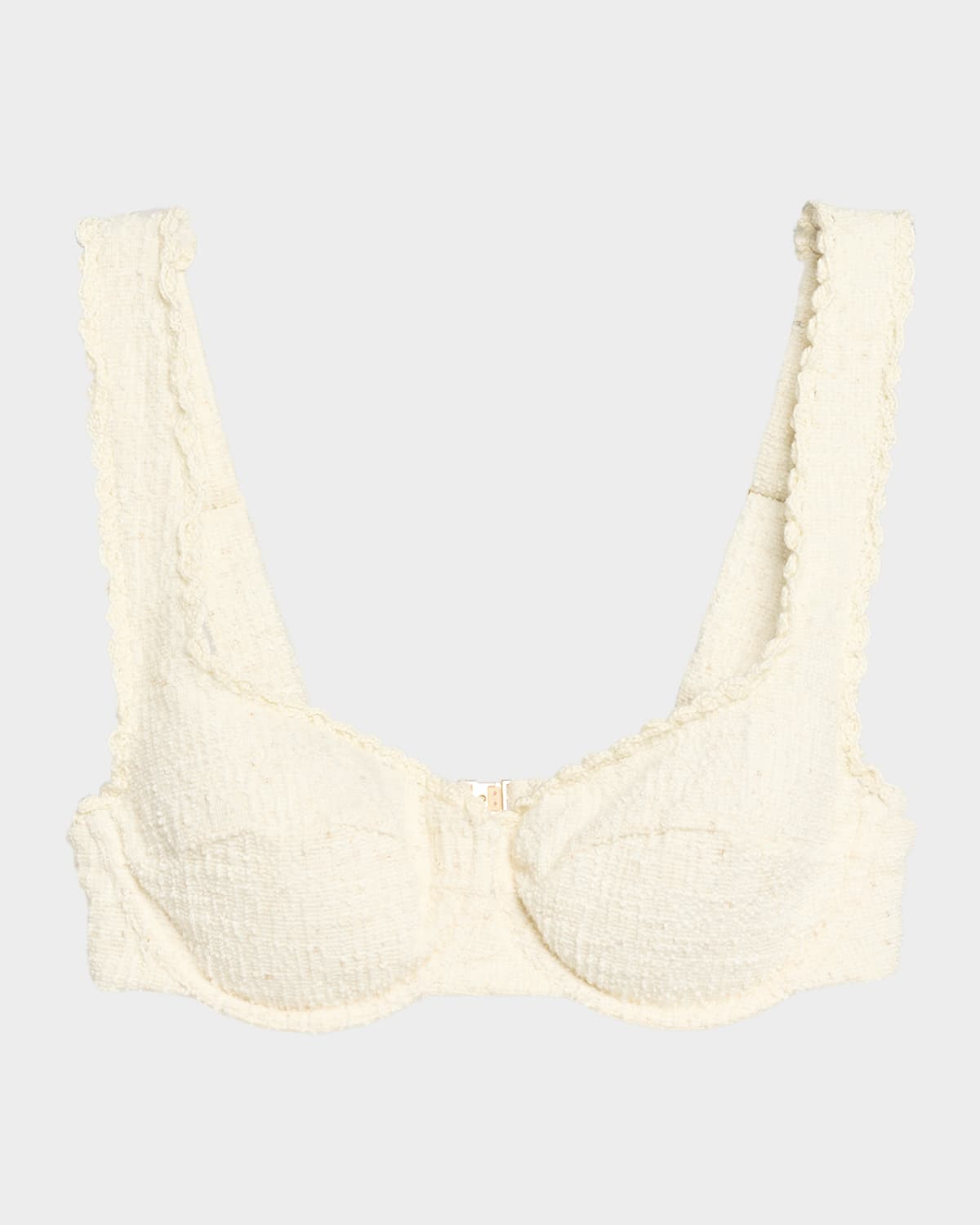 Crafted from textured tweed, the "Klara" balconette bikini top by SIMKHAI offers a feminine design with its scalloped trim details Sweetheart neckline Wide, adjustable shoulder straps for added support Structured underwire cups Midback clasps Polyester/rayon/cellulose acetate/linen Lining: Nylon/spandex Hand wash or dry clean Imported Bottoms sold separately