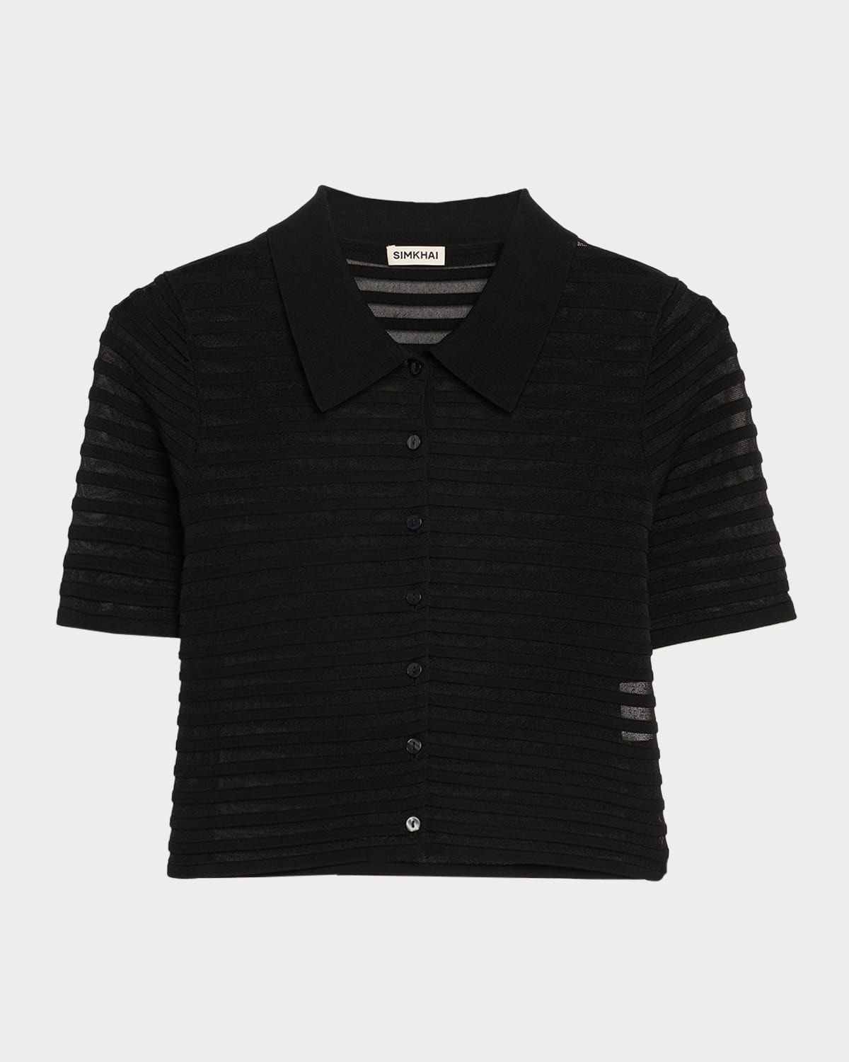 - SIMKHAI "Larken" sheer striped cardigan - Point collar; button-front - Short sleeves - Classic fit - Cropped length - Polyester/nylon/polyamide - Imported