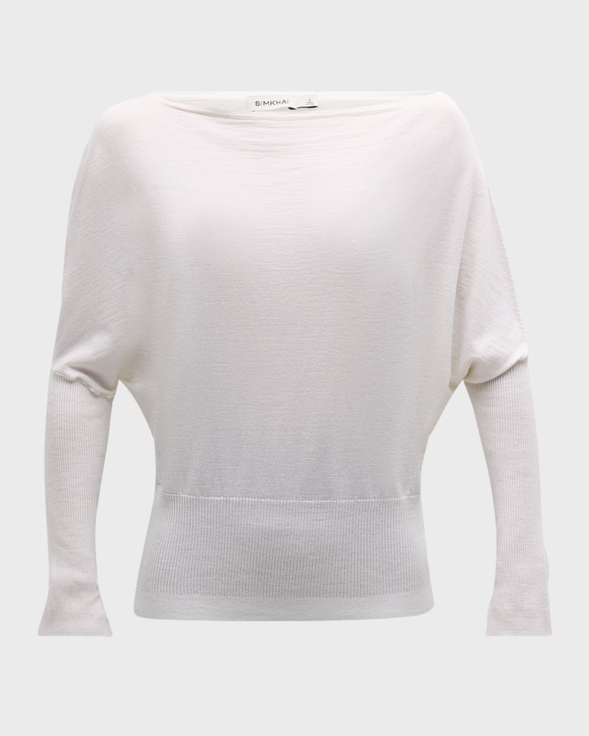 - SIMKHAI "Lavina" drapey sweater with elongated rib cuffs - One-shoulder neckline - Long sleeves - Hip length - Relaxed fit - Pullover style - Wool/Tencel® lyocell/polyester - Imported - Model is 5'10"/177cm.