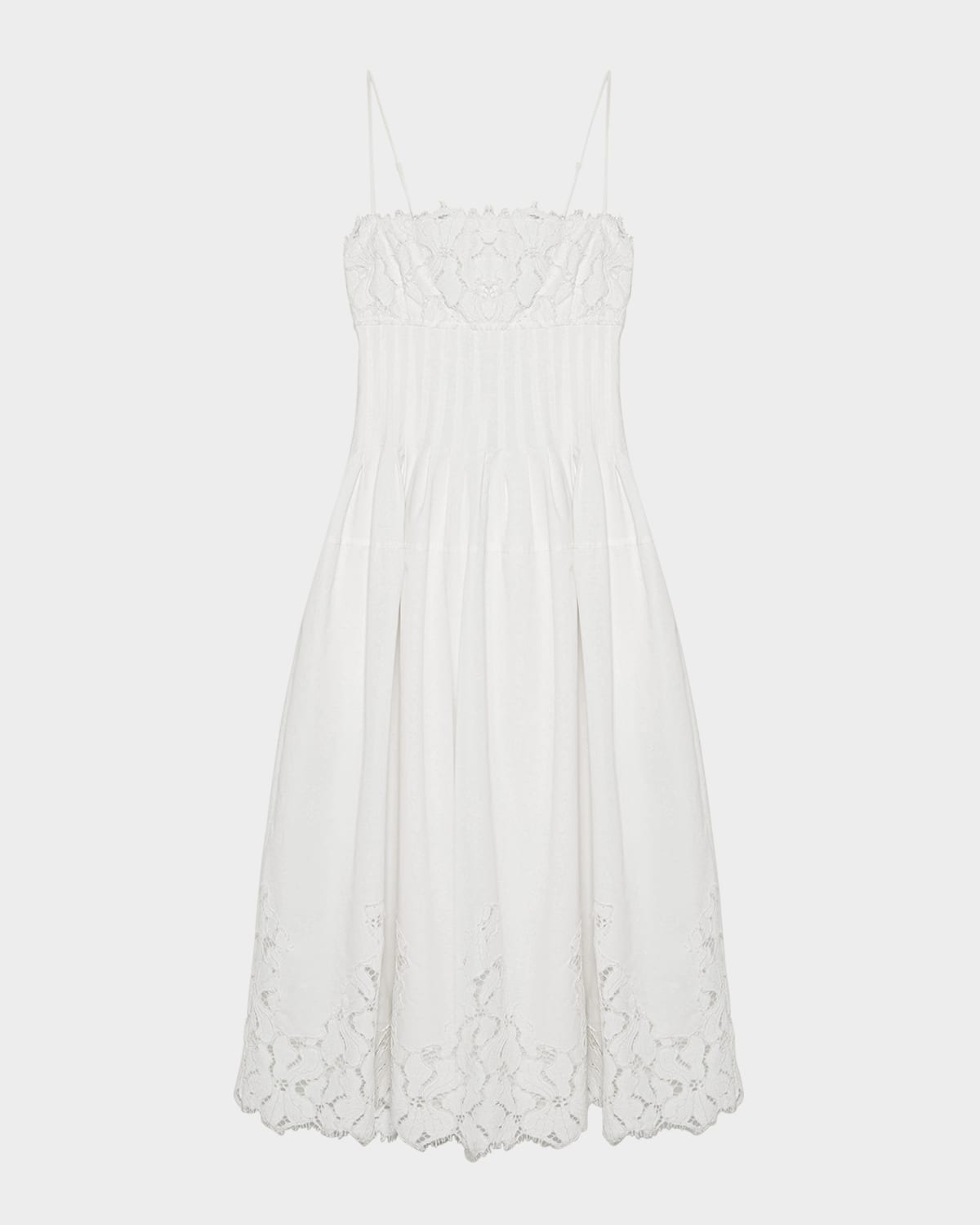 - SIMKHAI "Lilianna" lace embroidered midi dress accentuated with a corset-style bodice - Square neckline - Adjustable spaghetti straps - A-line silhouette - Hem falls below the knee - Side zip - Cotton/nylon/polyamide - Imported