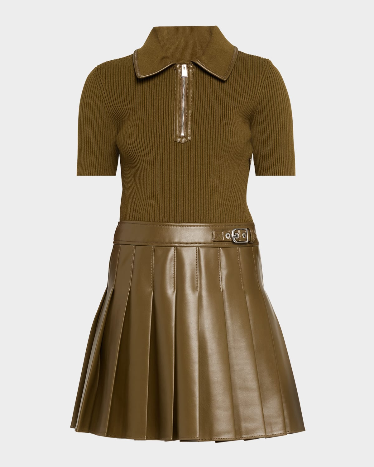 SIMKHAI "Linnie" combo mini dress elevated with a ribbed bodice and pleated vegan leather skirt Point collar; zipfront Short sleeves Side buckle detail Shirtdress silhouette Hem falls above the knee Invisible side zip Polyurethane/polyester Dry clean Imported