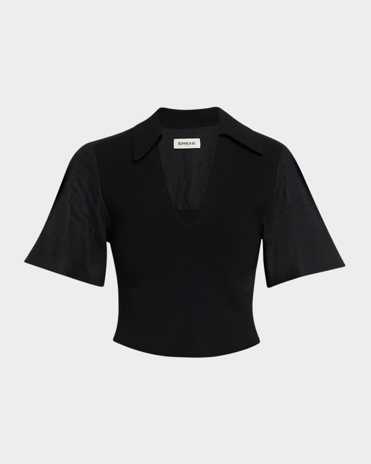 - SIMKHAI "Lizzie" knitted combo top elevated with linen sleeves - Point collar; V neckline - Short sleeves - Fitted - Hem sits at the hip - Pullover style - Viscose/linen/polyester - Imported