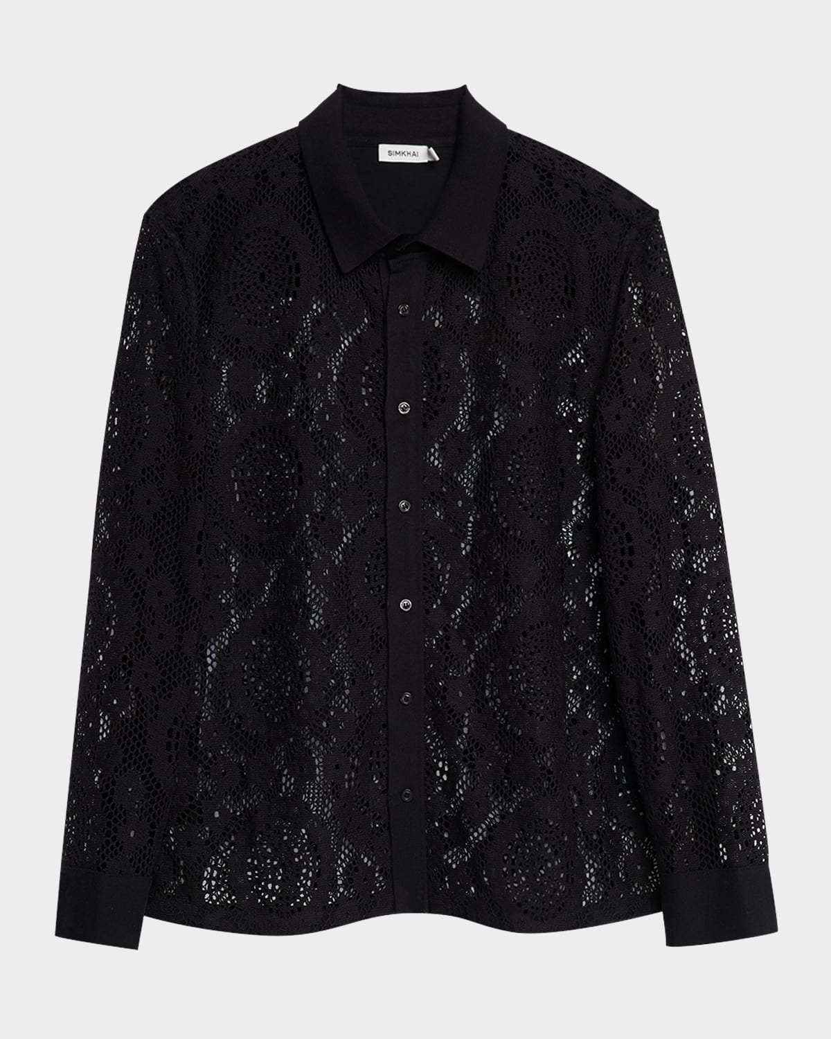 - SIMKHAI button-down shirt in solid lace with floral geometric motif - Spread collar - Long sleeves - Buttoned barrel cuffs - Yoked back shoulders - Straight hem - Regular fit - Linen/cotton/nylon/polyamide - Dry clean - Imported