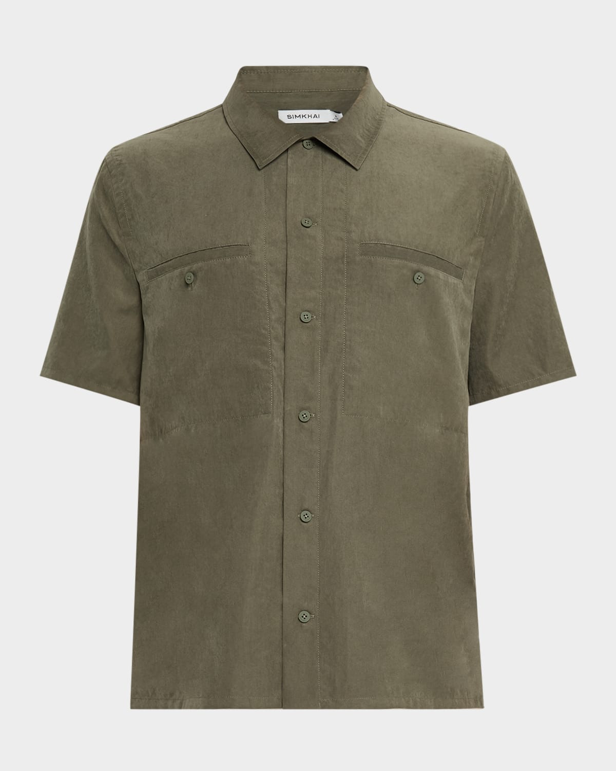 - SIMKHAI military work shirt crafted from lightweight twill - Point collar - Button front closure - Dual patch pockets with buttoned welt entry - Short sleeves - Yoked back shoulders - Side vent - Regular fit - Polyester/nylon/polyamide - Dry clean - Imported