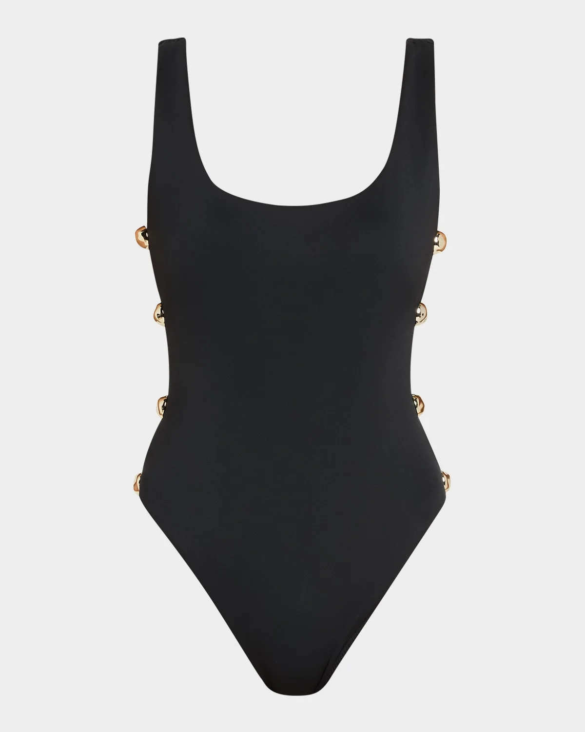 The "Mona" onepiece swimsuit from SIMKHAI features subtle side cutouts with goldtone studding Scoop neckline Moderate seat coverage Nylon/polyamide/elastane Hand wash Imported