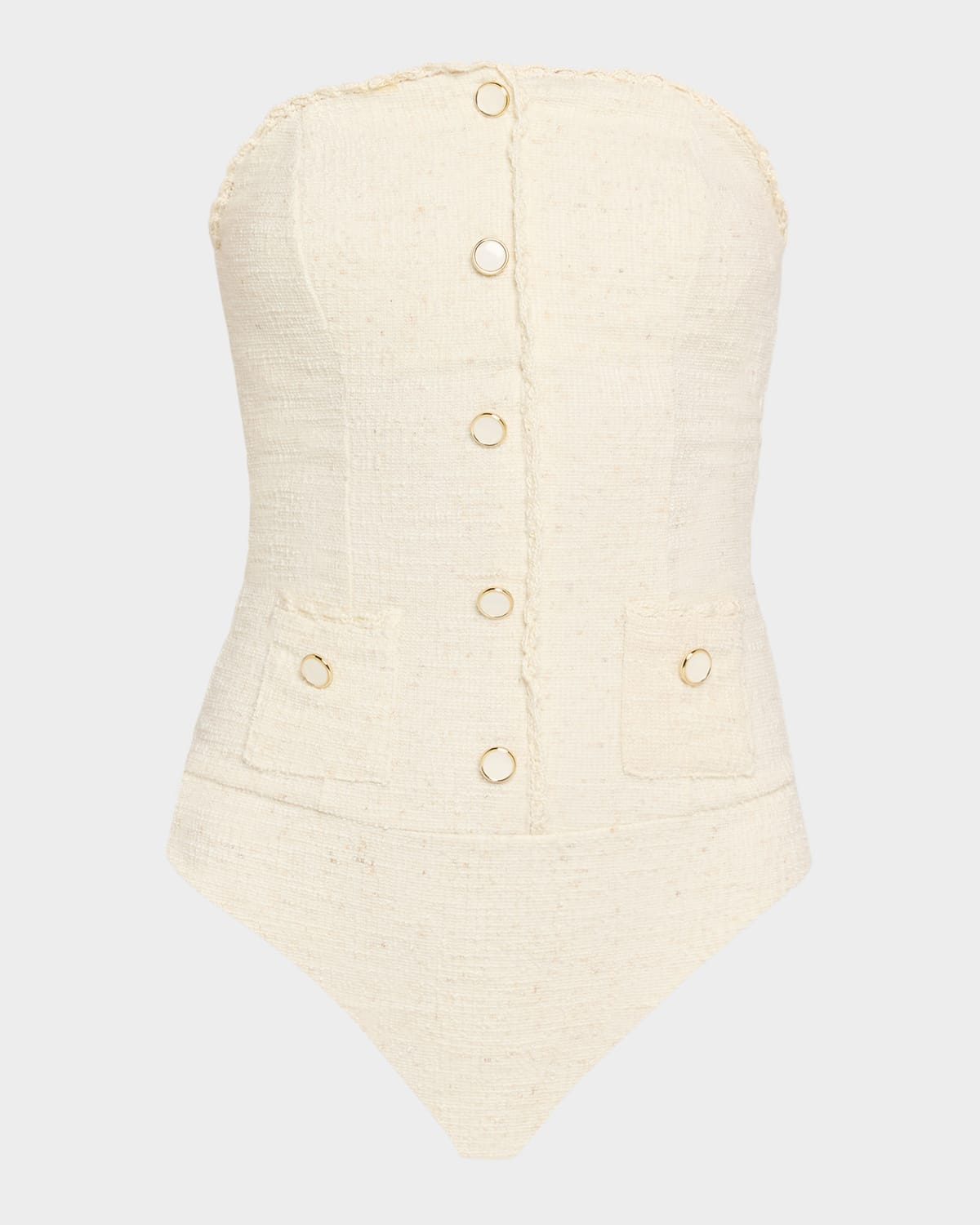 - SIMKHAI "Natalie" textured bandeau one-piece swimsuit accented with crochet trim and button detailing - Strapless neckline; button front - Dual buttoned patch pockets - Moderate seat coverage - Polyester/spandex/nylon/polyamide - Hand wash or dry clean - Imported