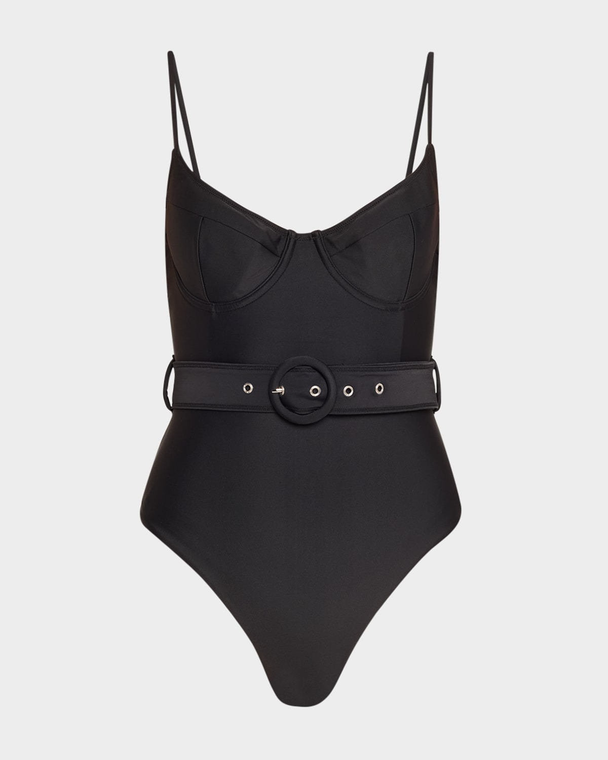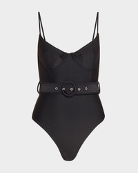 - SIMKHAI "Noa" slimming one-piece swimsuit with boned bustier underwire - Sweetheart neckline - Adjustable straps - Removable buckle belt - Moderate seat coverage - Nylon/polyamide/elastane - Imported - Proposition 65 warning for California residents