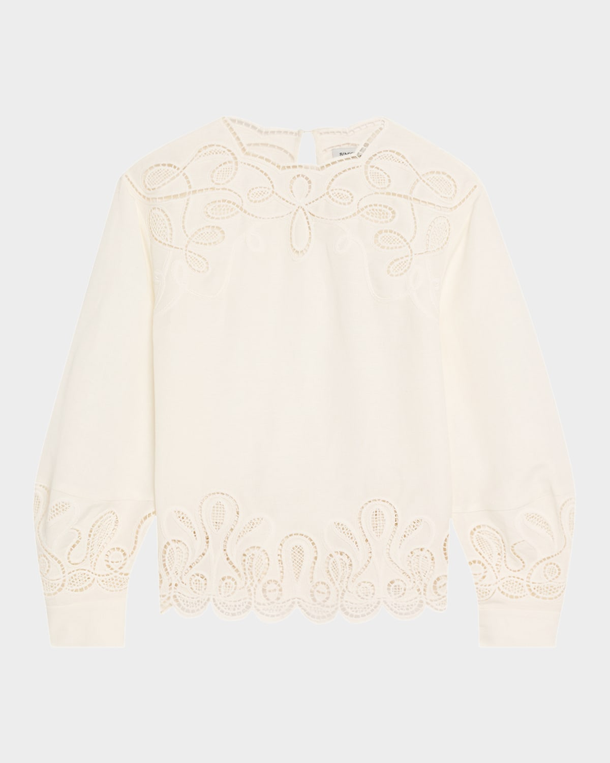 - SIMKHAI "Wendlyn" embroidered linen-blend top - Crew neckline - Long sleeves with button cuffs - Classic fit - Hem sits at the hip - Back keyhole closure - Linen/viscose - Dry clean - Imported