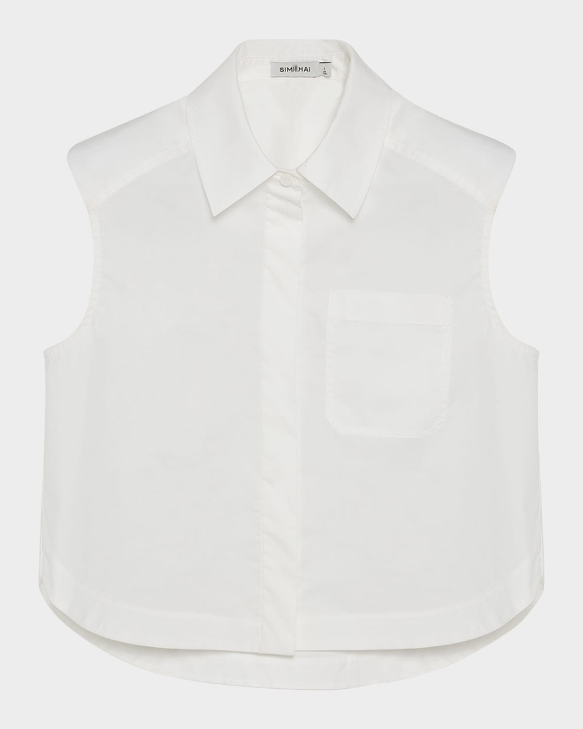 - SIMKHAI "Winslow" crisp cotton poplin shirt - Point collar - Sleeveless - Chest pocket - Classic fit - Hem sits at the hip - Concealed button-front - Cotton/polyester - Dry clean or machine wash cold - Imported