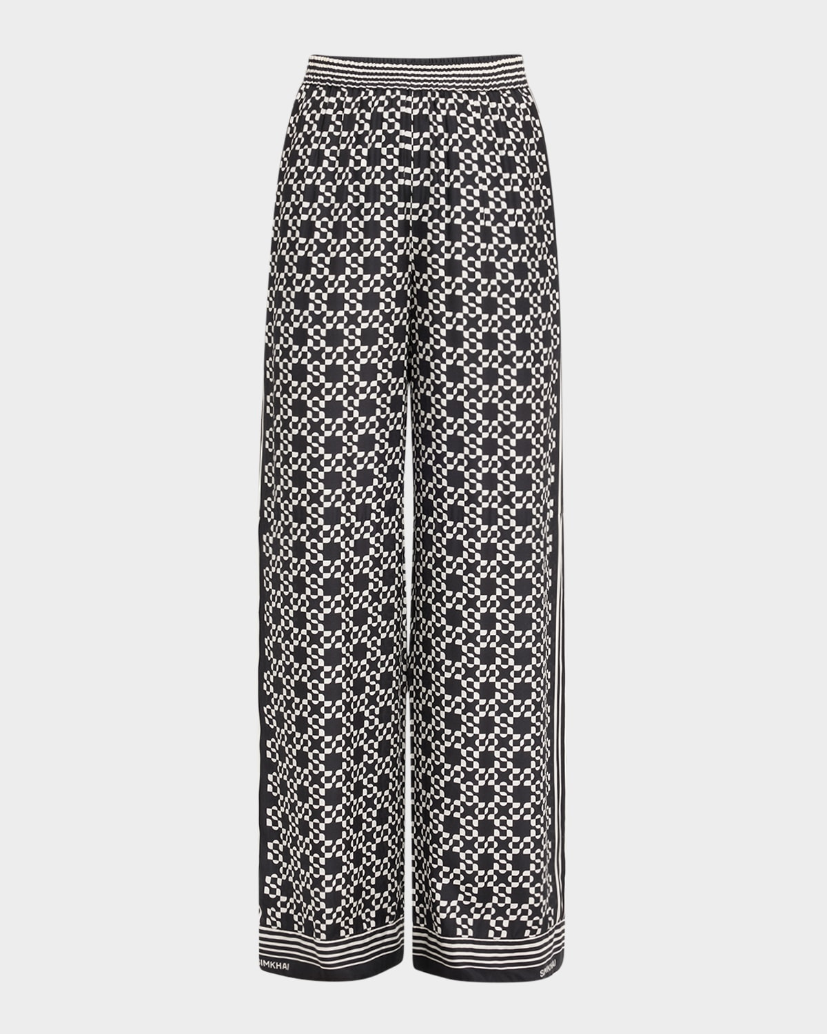 - SIMKHAI "Zuna" pajama-style pants crafted from a lustrous silk blend fabric - Approx. 13" rise; 31" inseam - High-rise waistband - Side seam pockets - Full length - Straight legs - Pull-on style - Tencel® lyocell/silk - Dry clean - Made in USA
