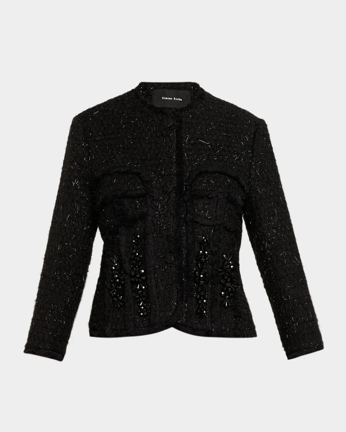Designed in brushed tweed with tonal embellished floral details, this jacket by Simone Rocha features a flattering cinched-in waist silhouette Collarless neckline 3/4 sleeves; button cuffs Chest flap pockets Hip length Button front closure Cotton/wool/polyester Made in Portugal Proposition 65 warning for California residents