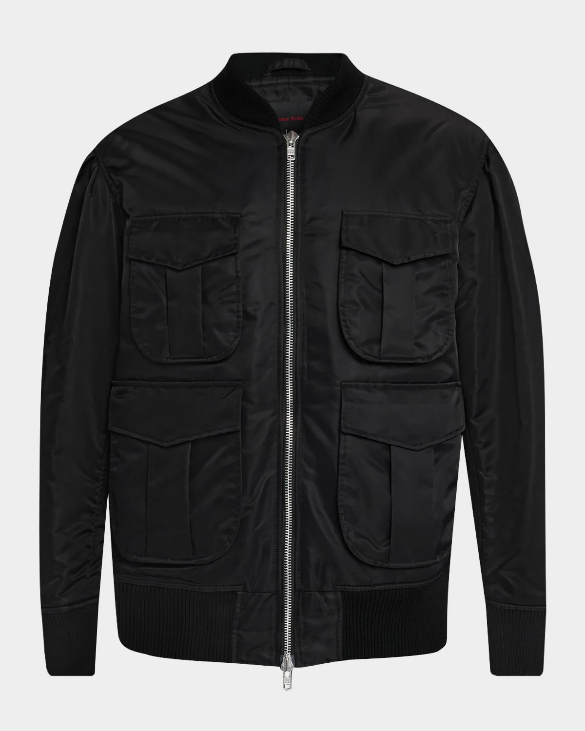This satin bomber jacket by Simone Rocha boasts a voluminous silhouette and exaggerated front pockets, resulting in a utilitarian look. Spread collar Twoway zip closure Four front flap pockets Ribbed cuffs and hem Oversized fit Nylon/polyamide Lining: Acetate/cupro Dry clean Made in Portugal