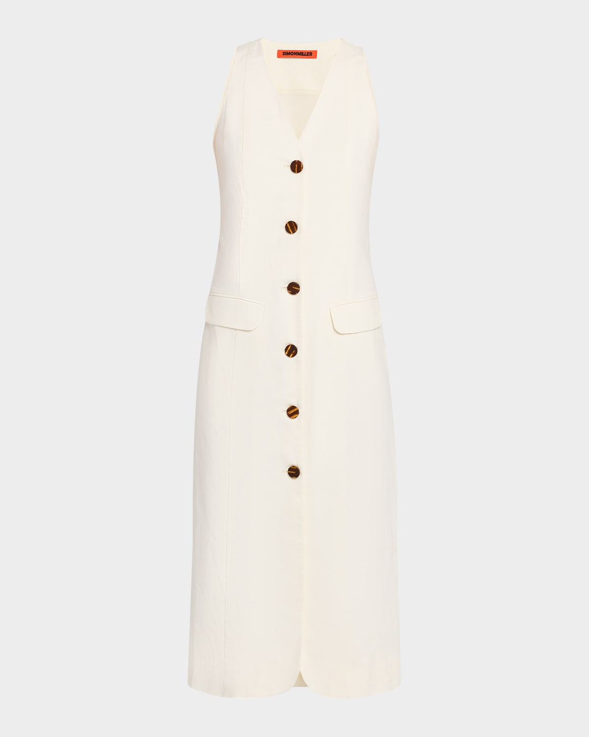 - SIMONMILLER "Zapata" lightweight linen-blend dress - V neckline - Sleeveless - Hip flap pockets - Hem falls below the knee - Button front closure - Linen/cotton - Imported