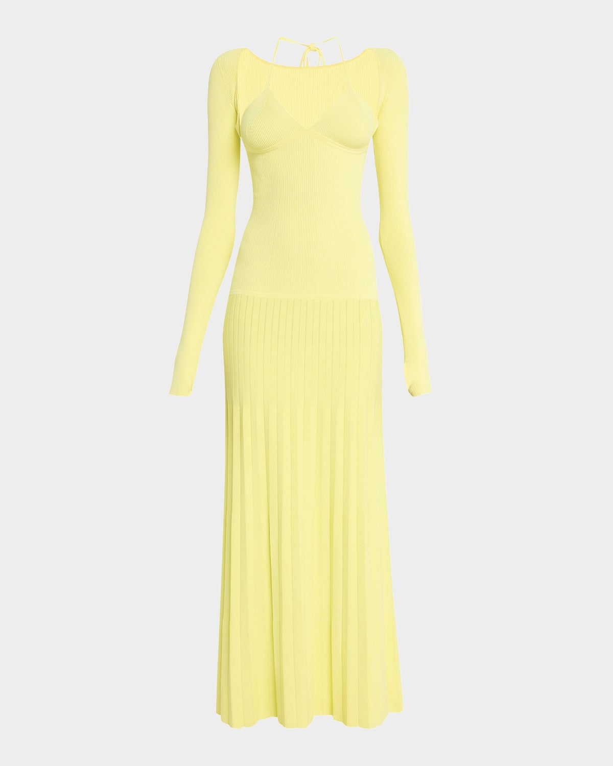 - SIR "Juniper" contoured mini dress crafted from a lightweight fine knit - Cut-out halter neckline - Long sleeves with thumbholes - Fit-and-flare silhouette - Pleated full-length skirt - Slipover style - Polyester - Imported