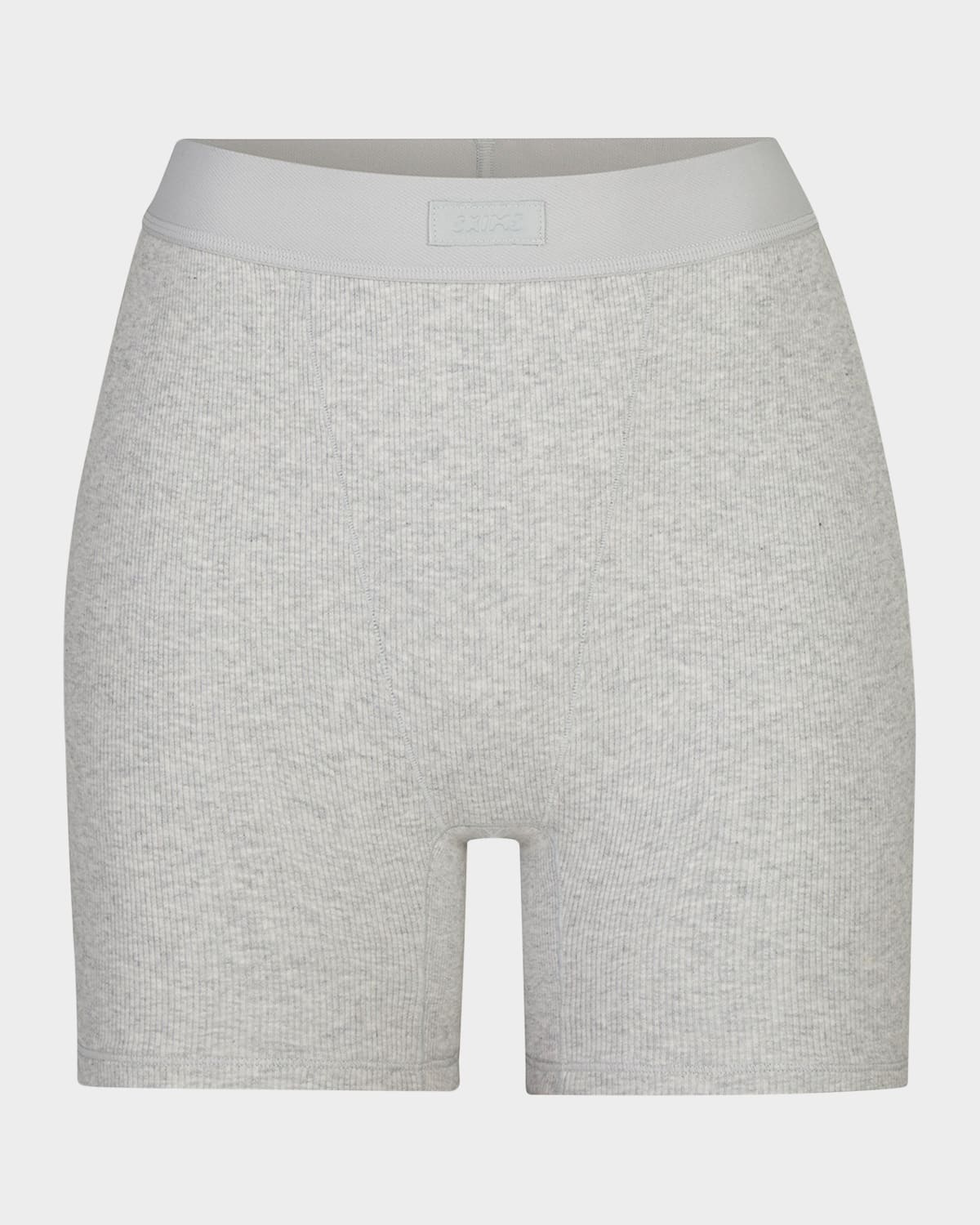 SKIMS boxers in breathable stretch cotton rib fabric Highrise sits high on the hips Elasticized logo patch waistband Hem hits at upper thigh Formfitting Pullon style Cotton/elastane Imported