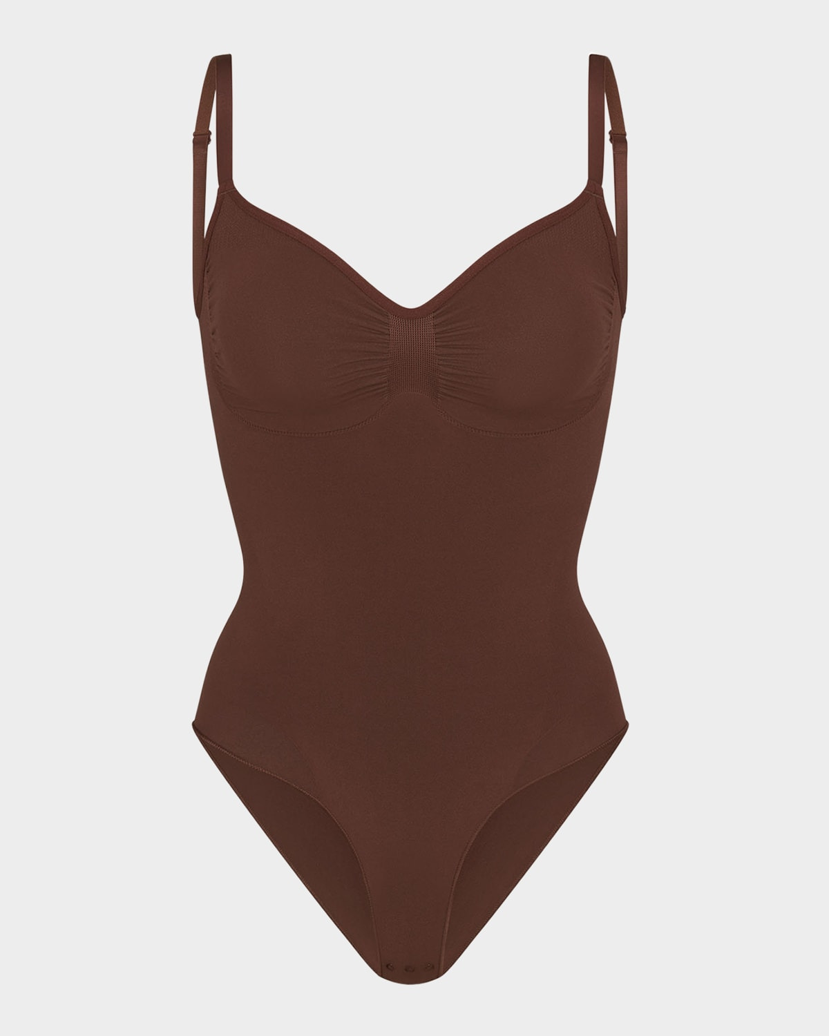 SKIMS brief bodysuit with strong targeted compression V neckline Sleeveless Adjustable straps Cheeky seat coverage Formfitting Wide, cottonlined snap gusset Nylon/polyamide/elastane Imported