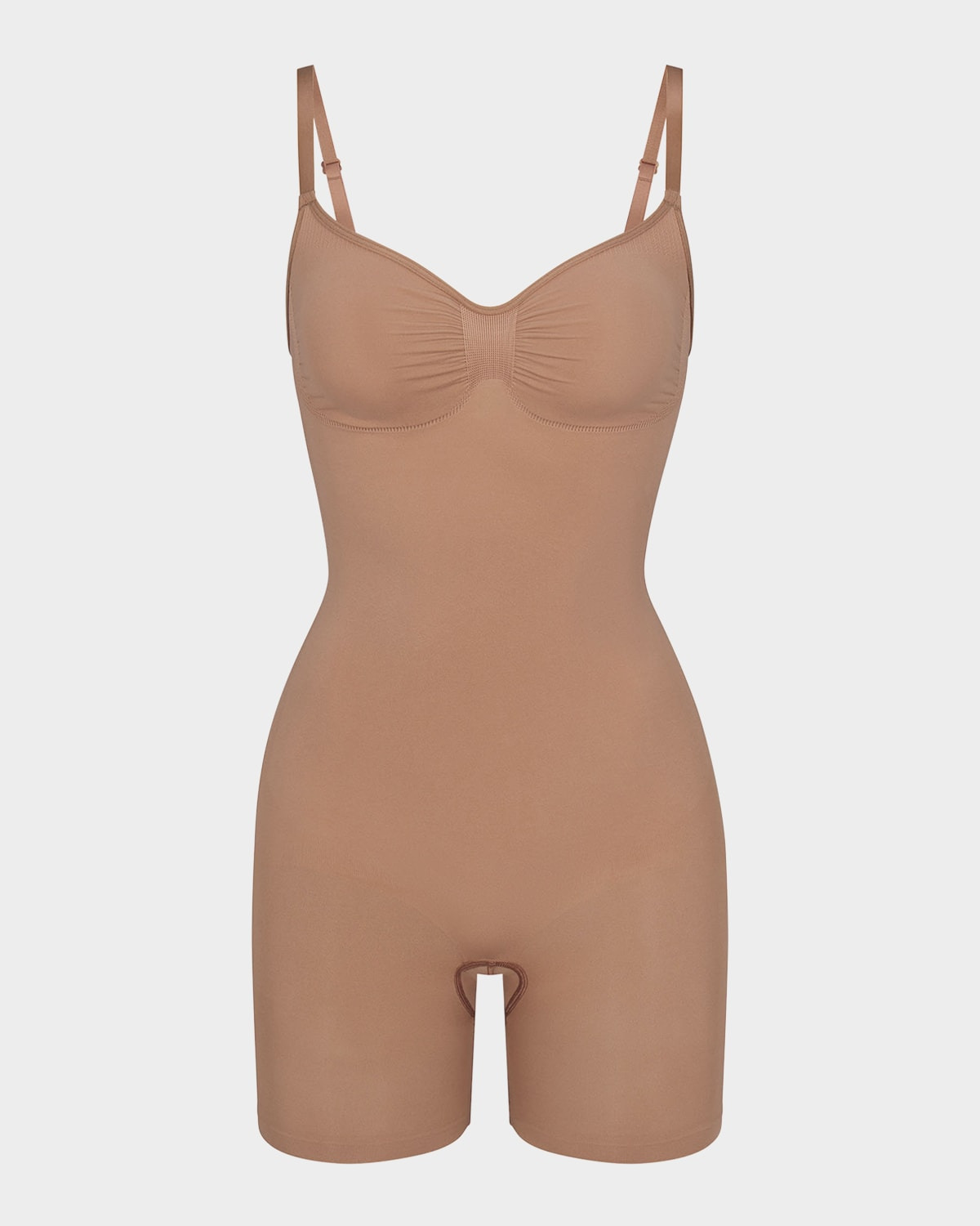 SKIMS sculpting bodysuit with front bust ruching Strong compression along the tummy, core, waist, and back thigh V neckline Sleeveless Adjustable straps Midthigh length Formfitting Wide gusset Stepin style Nylon/polyamide/elastane Imported