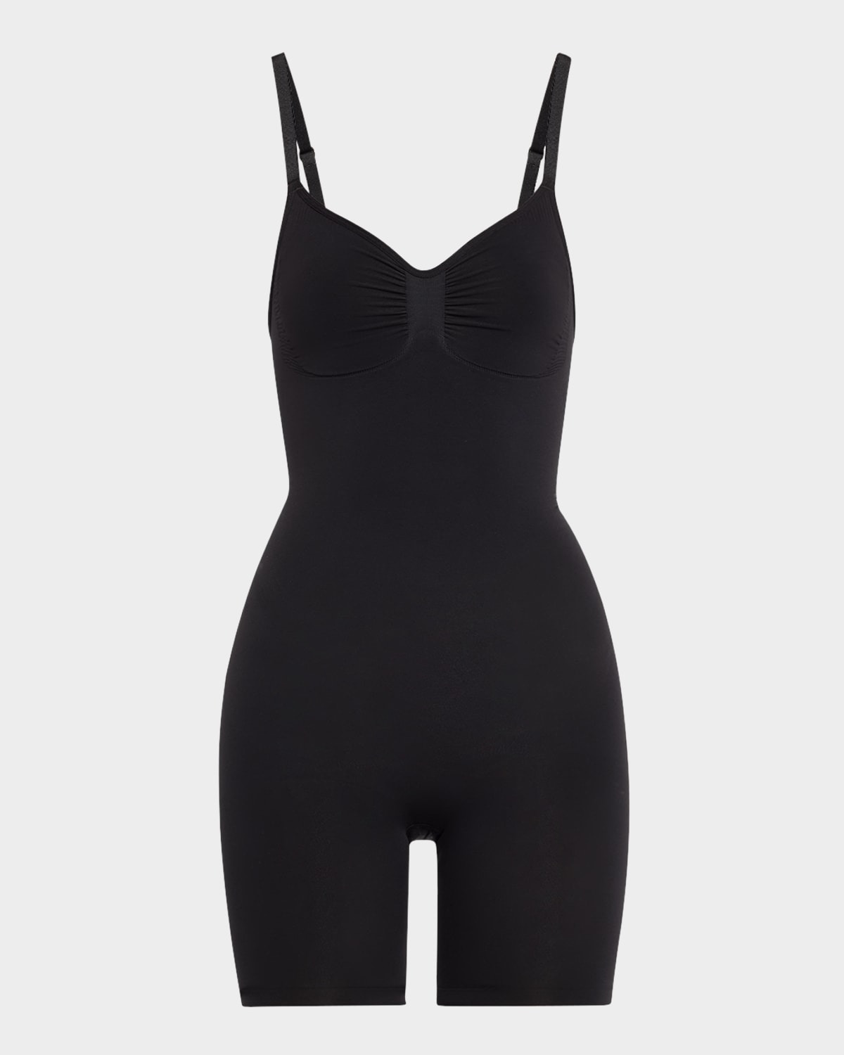 SKIMS sculpting bodysuit with front bust ruching Strong compression along the tummy, core, waist, and back thigh V neckline Sleeveless Adjustable straps Midthigh length Formfitting Wide gusset Stepin style Nylon/polyamide/elastane Imported