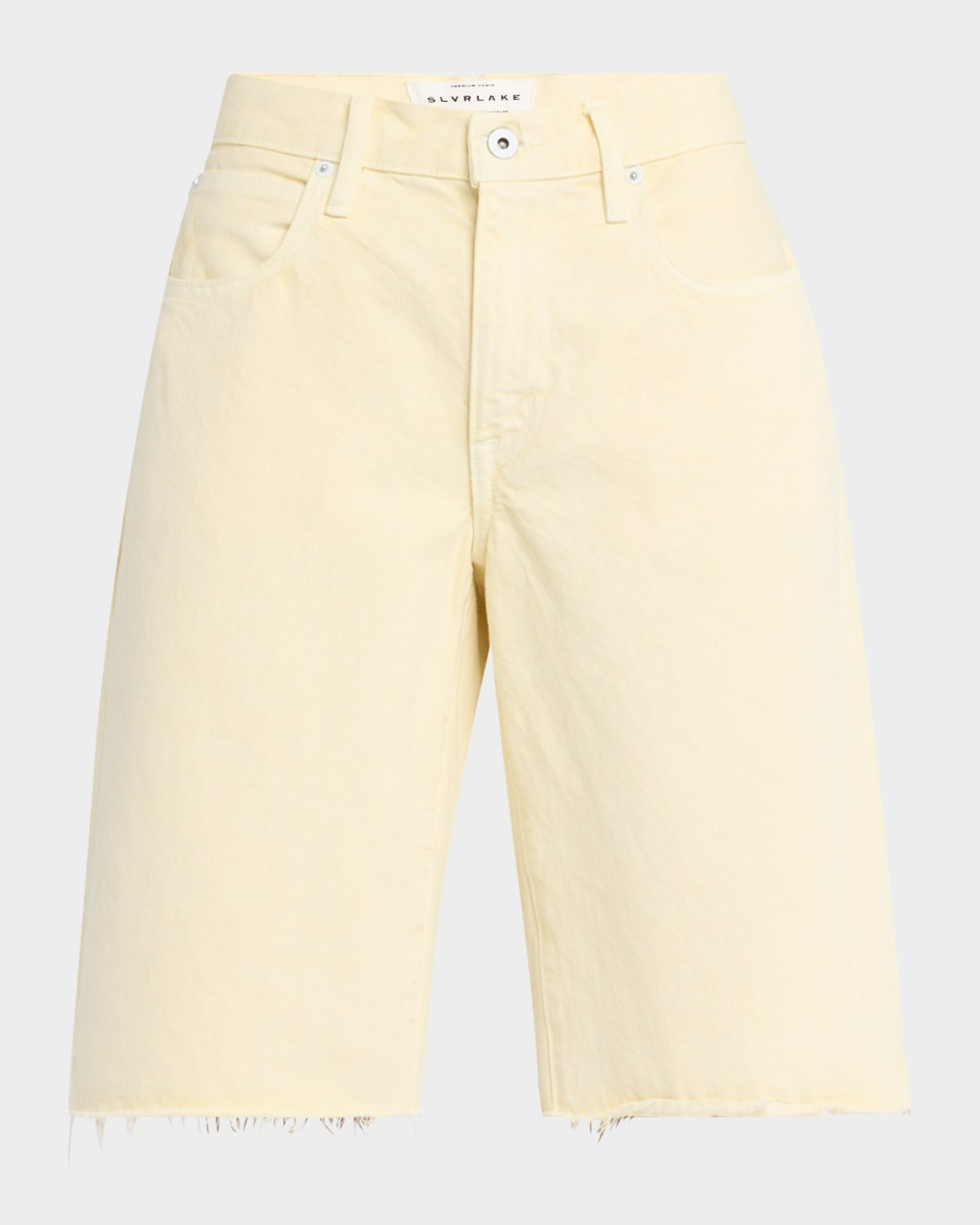 - SLVRLAKE "Mica" shorts featuring a raw hem in white denim - High rise - Five-pocket style - Straight fit - Knee-length - Button/zip fly; belt loops - Cotton - Made in USA from imported materials