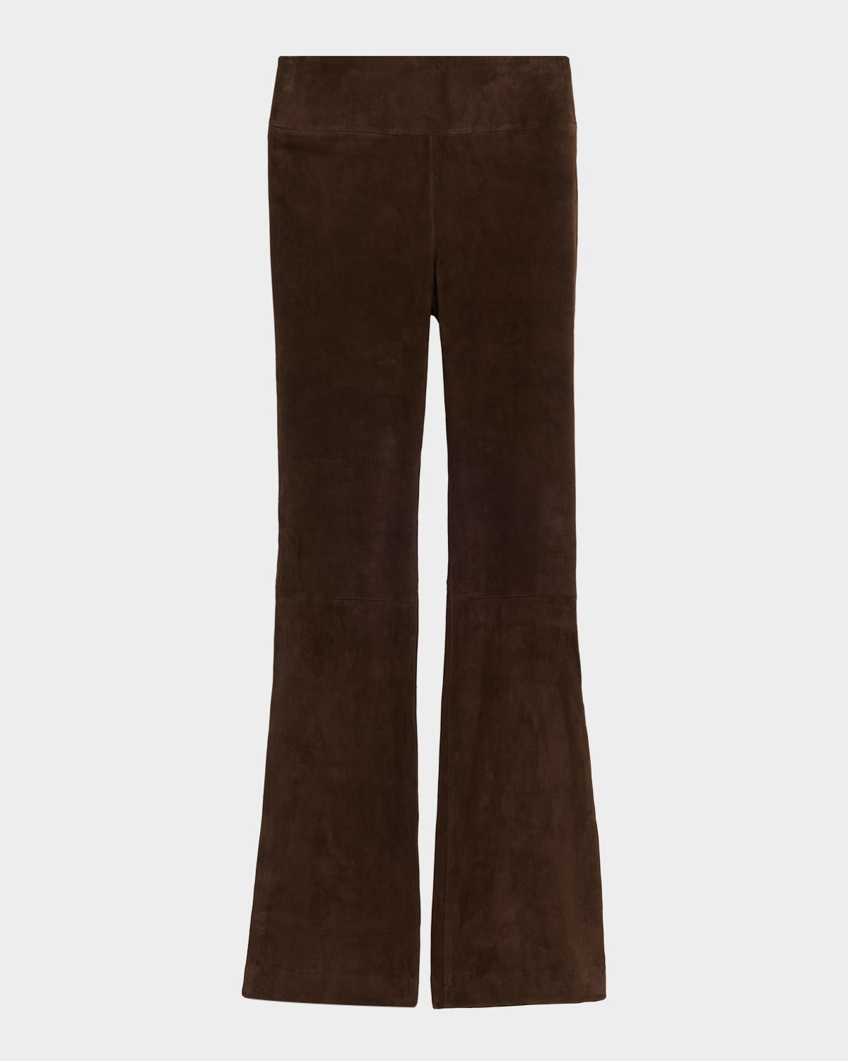 - SPRWMN leggings in soft suede. - Approx. 35" inseam. - High rise; wide waistband. - Fitted through hip and thigh; slim flare from knee. - Full length. - Pull-on style. - Handmade in Los Angeles, USA.