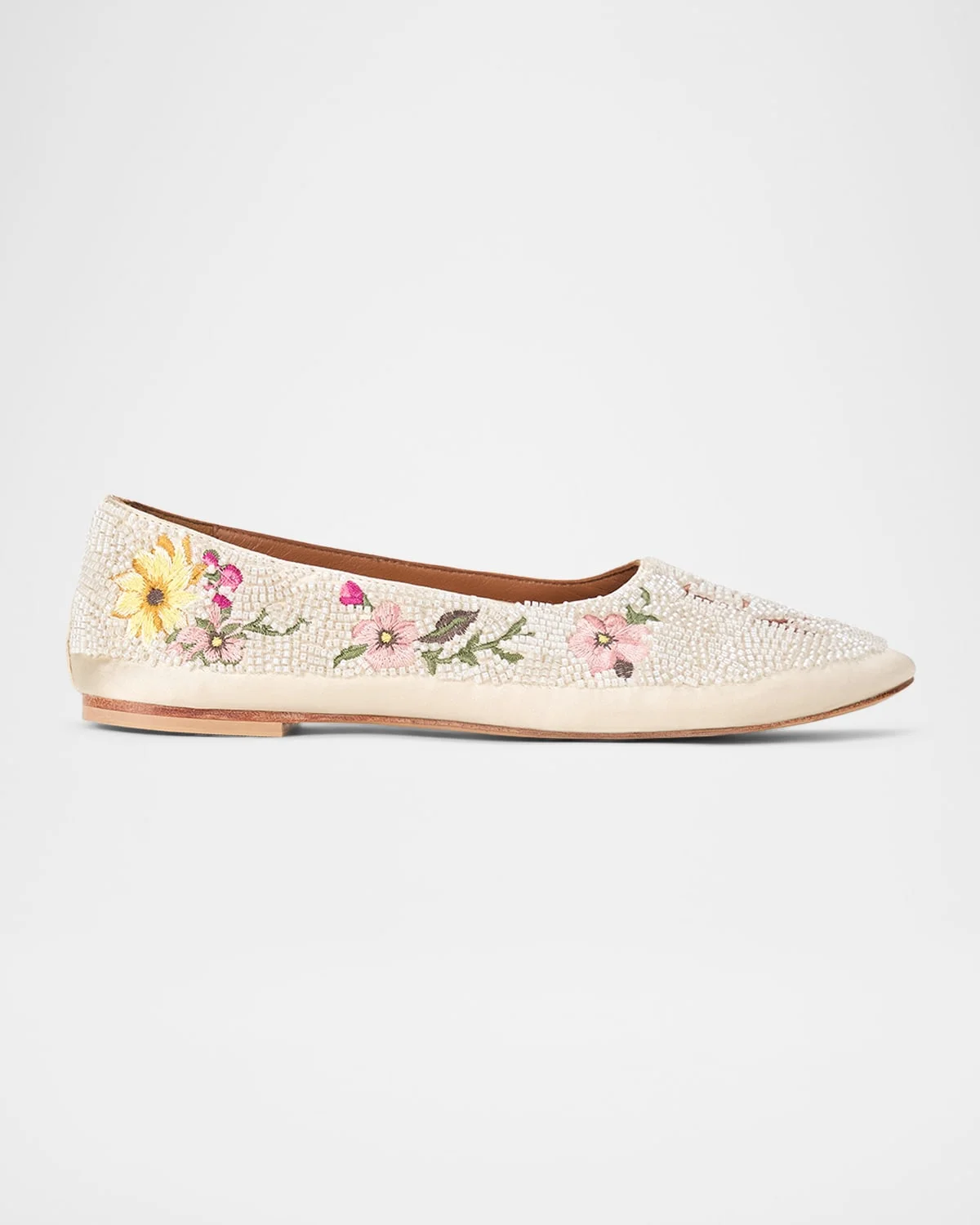 Intricate floral embroidery and tonal beadwork elevate the everyday "Alba" ballet flats by STAUD. Crafted with a satin upper and 'Do Not Disturb' embroidery at the toes, these shoes are a slipon statement piece. 0.17 in / 5 mm flat heel Round toe Slipon style Leather outsole Spot clean Imported