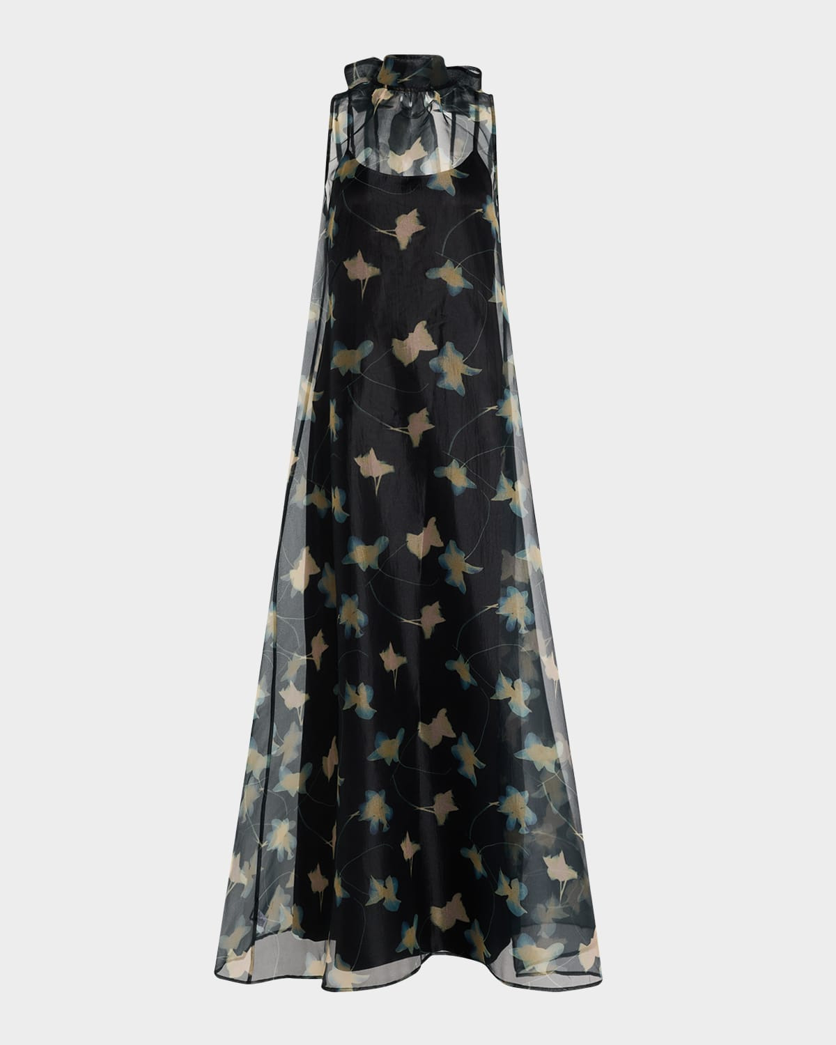 STAUD "Albee" sheer organza dress with an interior slip High neckline; selfties behind the neck Sleeveless Full length Aline silhouette Polyester Lining: Polyester/spandex Imported