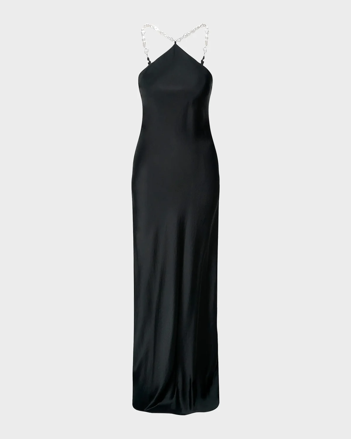 The "Cadence" floorlength slip dress by STAUD is crafted in lustrous satin with beaded pearly straps Halter neckline Sleeveless Full length Aline silhouette Invisible back zipper Acetate/polyester Dry clean Imported