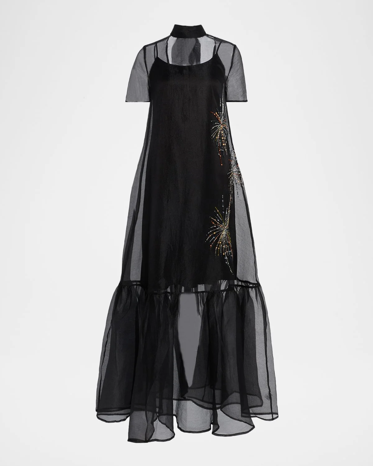 STAUD's "Calluna" dress is crafted from sheer organza with a tiered ruffle hem and a midi slip lining Approx. 60"L from shoulder to hem High neckline; selfties behind the neck Short sleeves Full length Aline silhouette Polyester Lining: Polyester/elastane Dry clean Imported