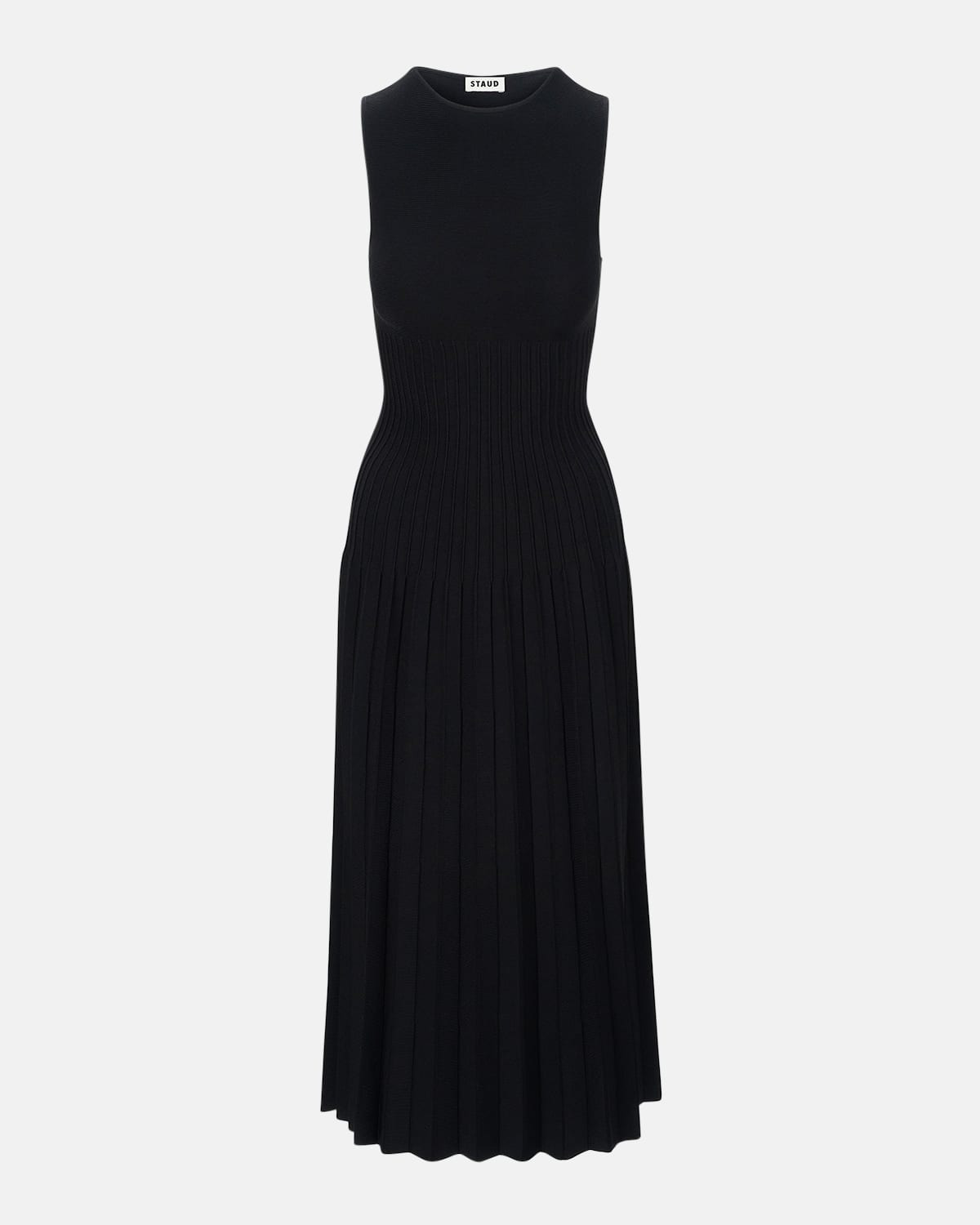 - STAUD "Elyse" pleated dress with flattering ottomon stitch detailing through the waist - High round neckline - Sleeveless - Fitted waist - Hem falls below the knee - Slipover style - Viscose/nylon/polyamide/elastane - Imported
