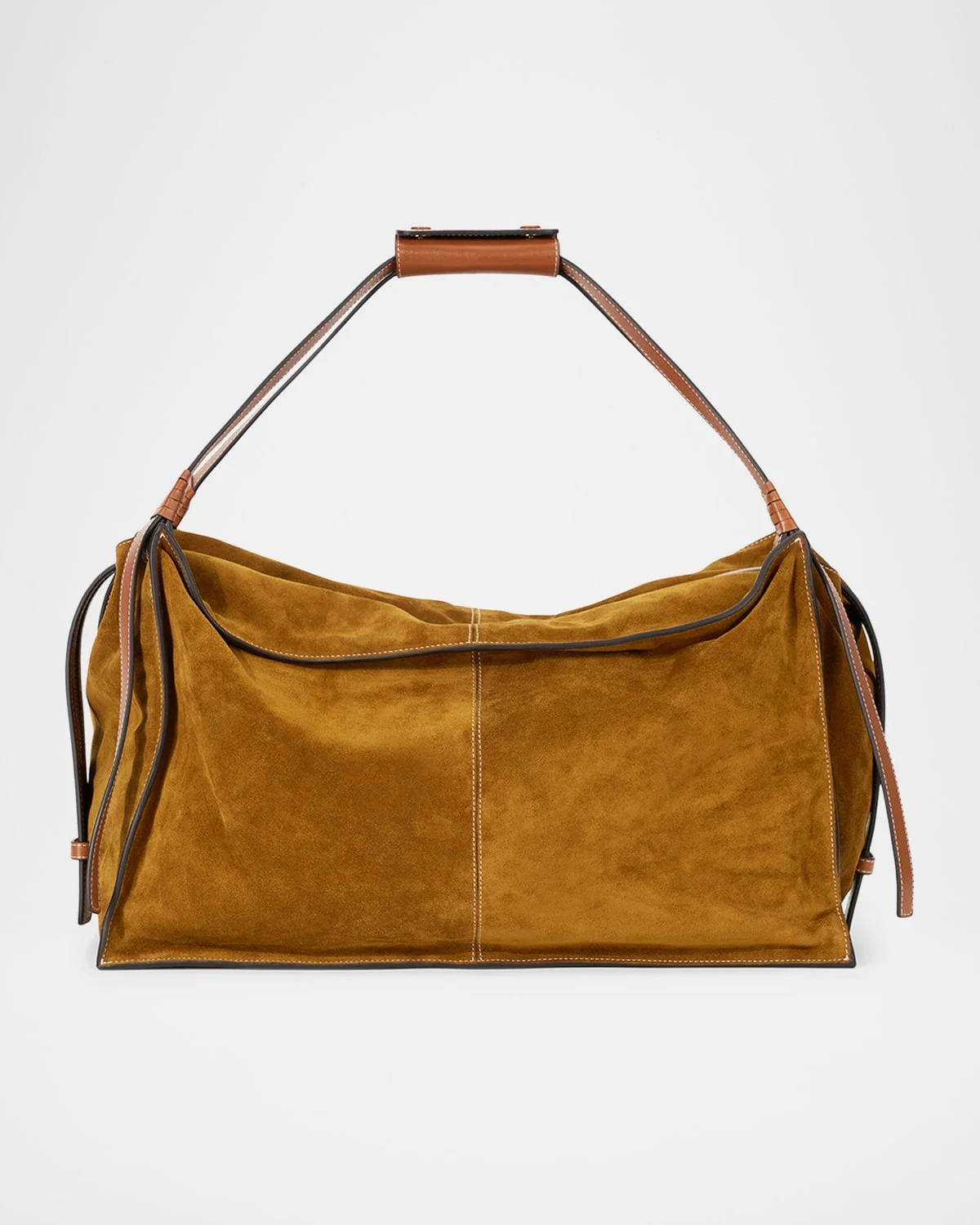 - STAUD "Harold" suede hobo bag with leather trim - Shoulder straps with snap strap closure - Zip top closure - Approx. 10.5"H x 17.5"W x 8"D - Spot clean - Imported