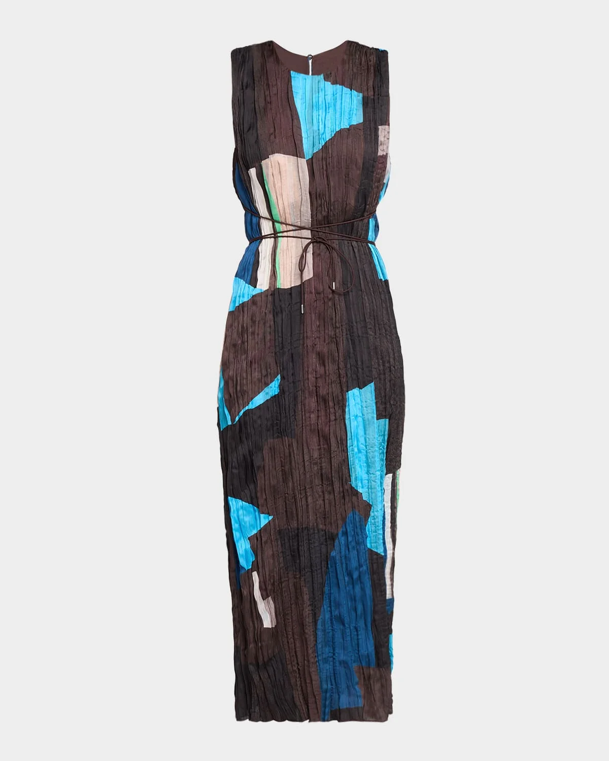 The "Mizu" plisse dress by STAUD features a bold geometric pattern with a removable waist tie Round neckline Sleeveless Hem falls below the knee Column silhouette Back keyhole/buttonandloop closure Polyester Lining: Elastane/polyester Dry clean Imported
