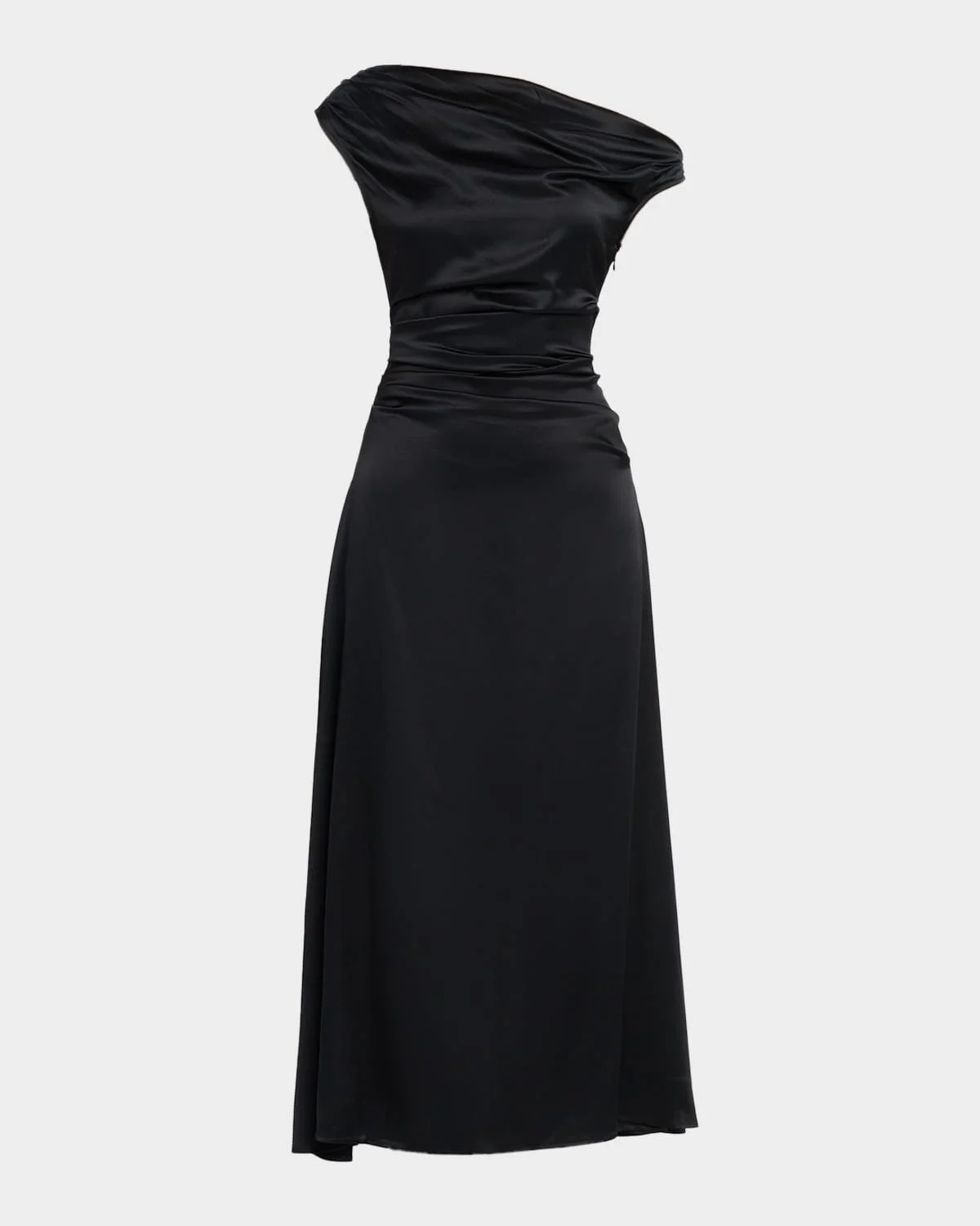 Crafted of stretch silk, Staud's "Phare" midi dress features an asymmetric offtheshoulder design with ruching at the waist Approx. 54"L from shoulder to hem Asymmetric offtheshoulder neckline Sleeveless Hem falls below the knee Side zip closure Silk/elastane Dry clean Imported