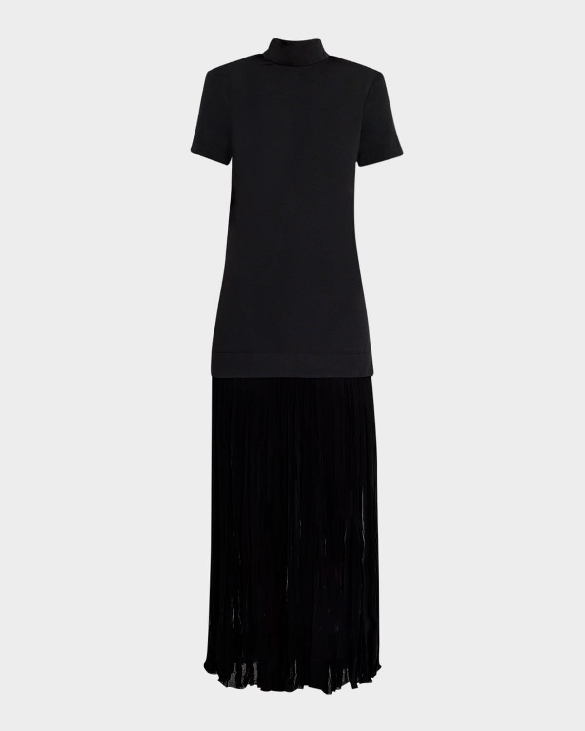 A new tentstyle maxi dress, the "Pia" by STAUD, is crafted in grosgrain with a sheer chiffon skirt High neckline; selfties behind the neck Short sleeves Side seam pockets Open back Centercut back vent Full length Center back zipper Cotton/polyester Dry clean Imported