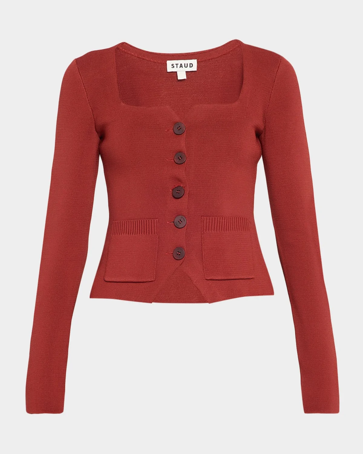Staud's "Rachela" knit top highlights the jacketinspired look with a square neckline, buttonfront closure, and ribknit trims at the patch pockets. Approx. 20"L from shoulder to hem Square neckline Long sleeves Front patch pockets Slim fit Hip length Button front closure Viscose/nylon Dry clean Imported
