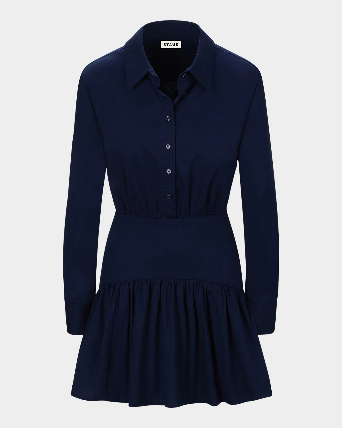 - STAUD "Rocco" shirtdress crafted from slightly stretchy cotton poplin fabric with a curved yoke at the hip - Spread collar; partial button front - Long sleeves; button cuffs - Hem falls above the knee - Fit-and-flare silhouette - Cotton/spandex - Imported